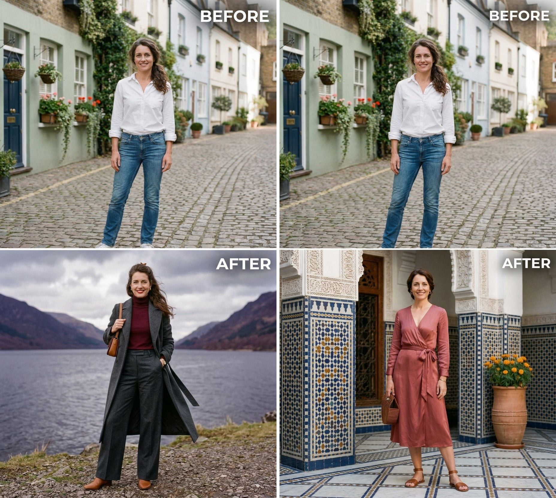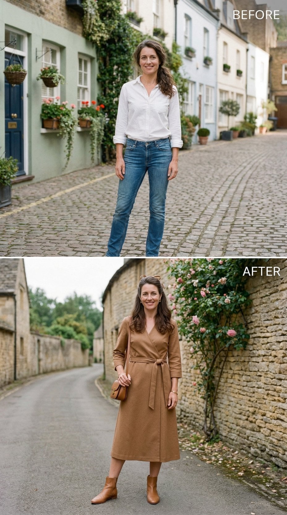 Before, cobblestone in Northern Europe framed white cotton and medium-wash straight-leg denim. After, warm ochre buildings and a stone fountain anchor the frame. The shift in backdrop mirrors the shift in palette: pale neutrals replaced by rich caramel monochrome.