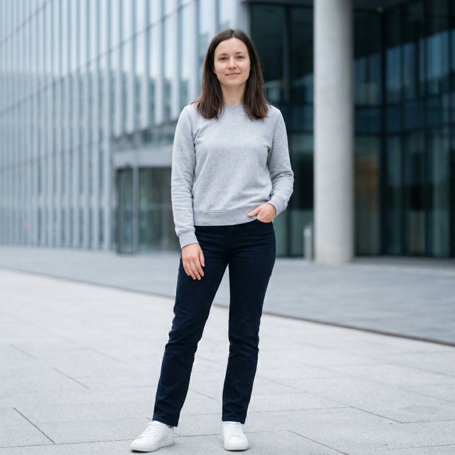 Grey cotton sweatshirt and navy straight-leg jeans made sense for a Tuesday afternoon, but they kept me locked in a perpetual casual loop. White canvas sneakers grounded the look in comfort, though the overall effect read more student than strategist.