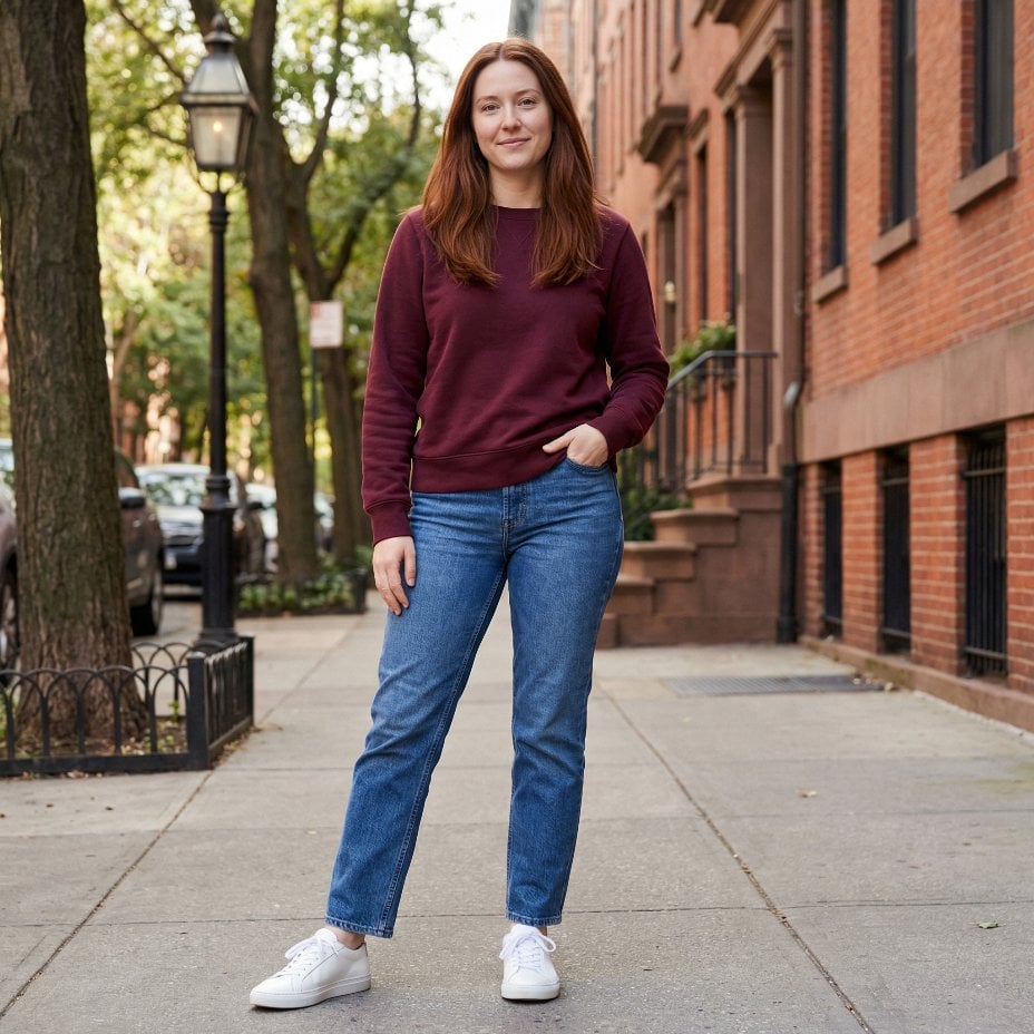 Outdoors on a tree-lined block I wore a burgundy crewneck sweatshirt tucked into mid-rise straight-leg jeans. Bronze tones warmed my long hair, which fell past my shoulders in soft waves. One hand rested in my pocket against the casual denim.