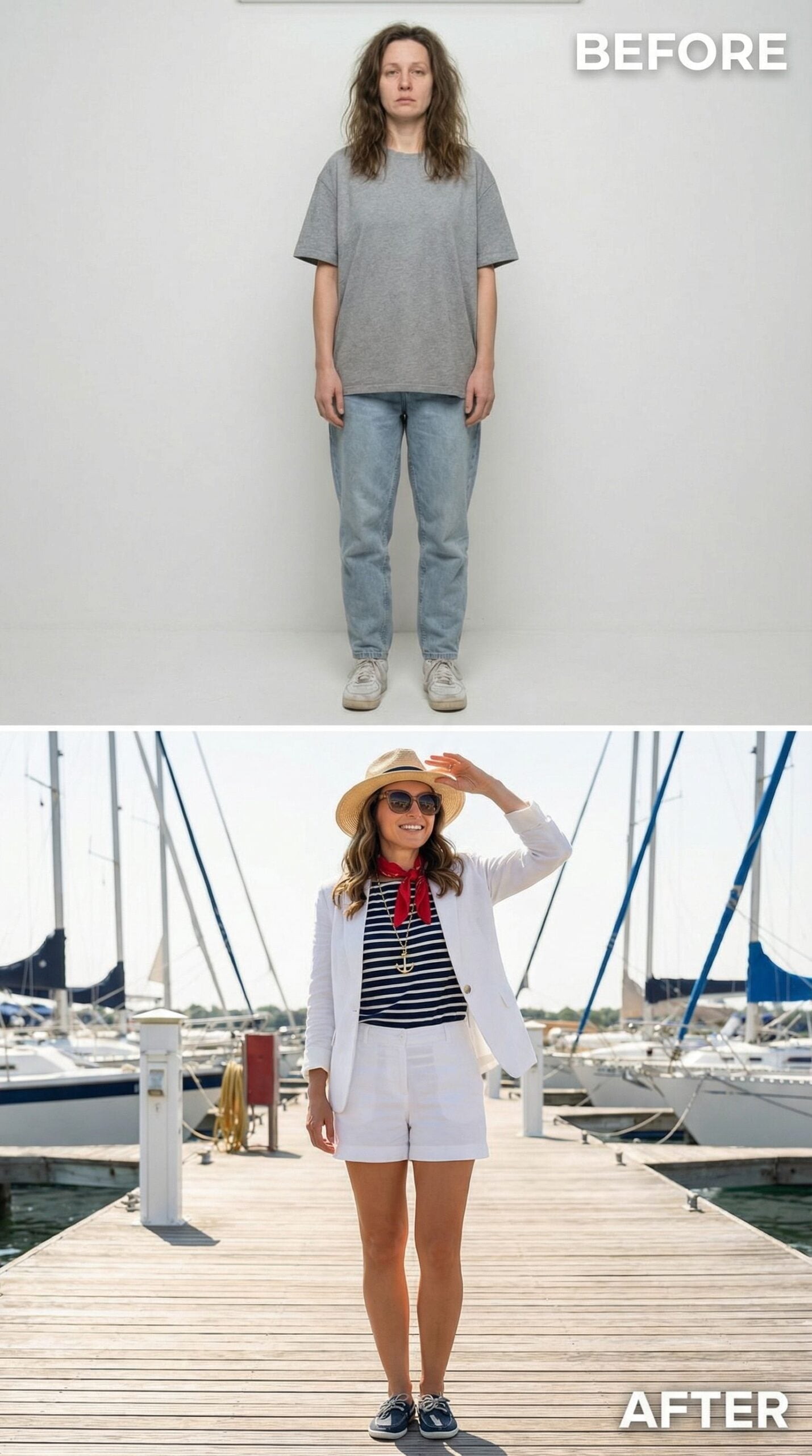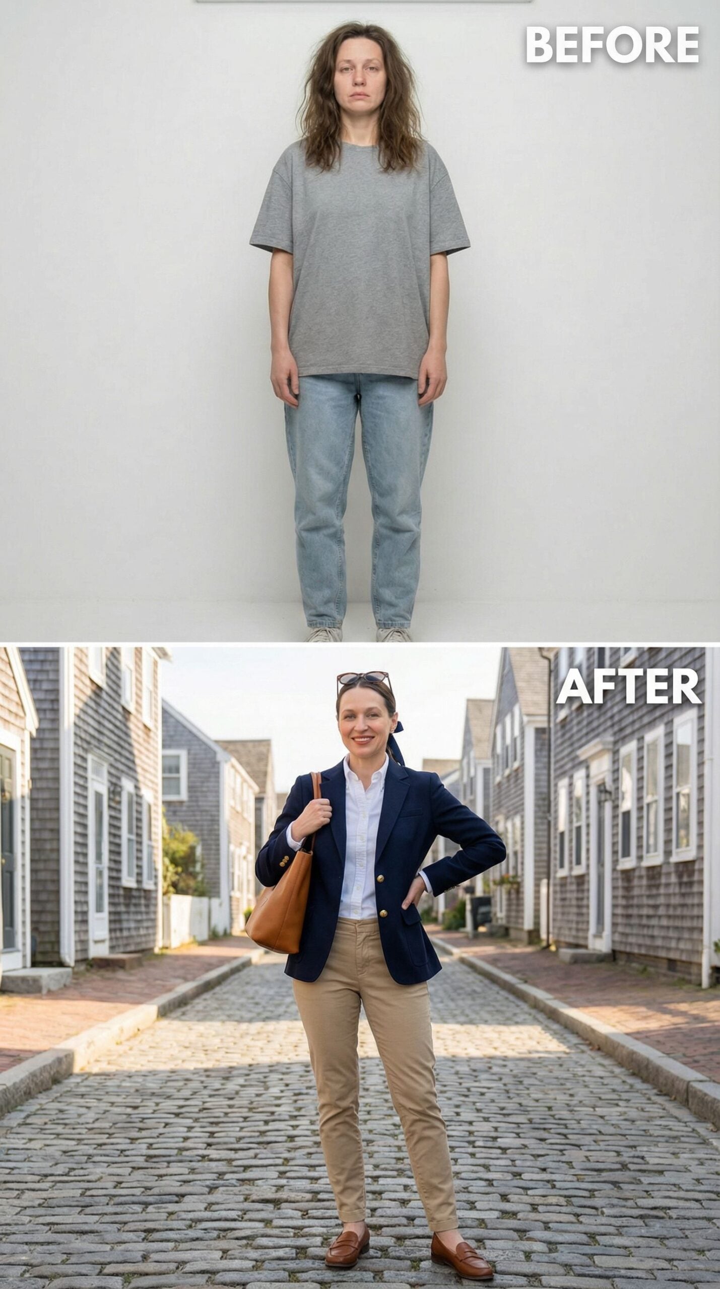 Transforming from a woman wearing an Old Money New England outfit in casual denim and gray tee, this elevated look channels yacht club sophistication with a navy double-breasted blazer featuring gold anchor buttons. Cream trousers and a crisp white blouse create timeless elegance, while cognac leather accessories and a classic pearl necklace complete the polished marina-ready ensemble.