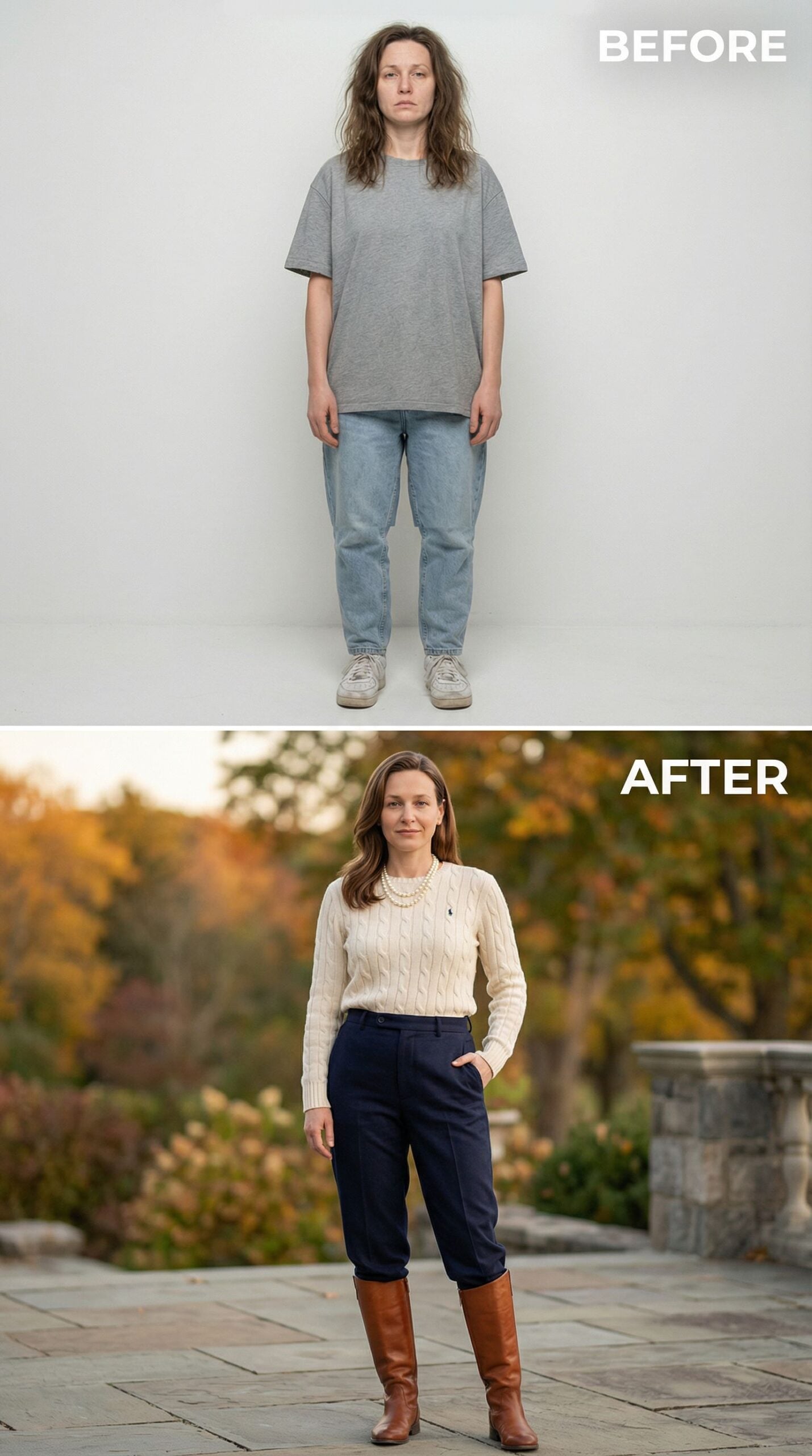 Cable-knit cream sweaters paired with navy trousers create instant preppy elegance that transforms any casual look. Rich cognac leather boots add luxurious texture while a delicate pearl necklace provides that quintessential country club polish. This sophisticated combination elevates weekend dressing with timeless New England charm, proving that classic pieces create the most impactful style transformations for modern women.