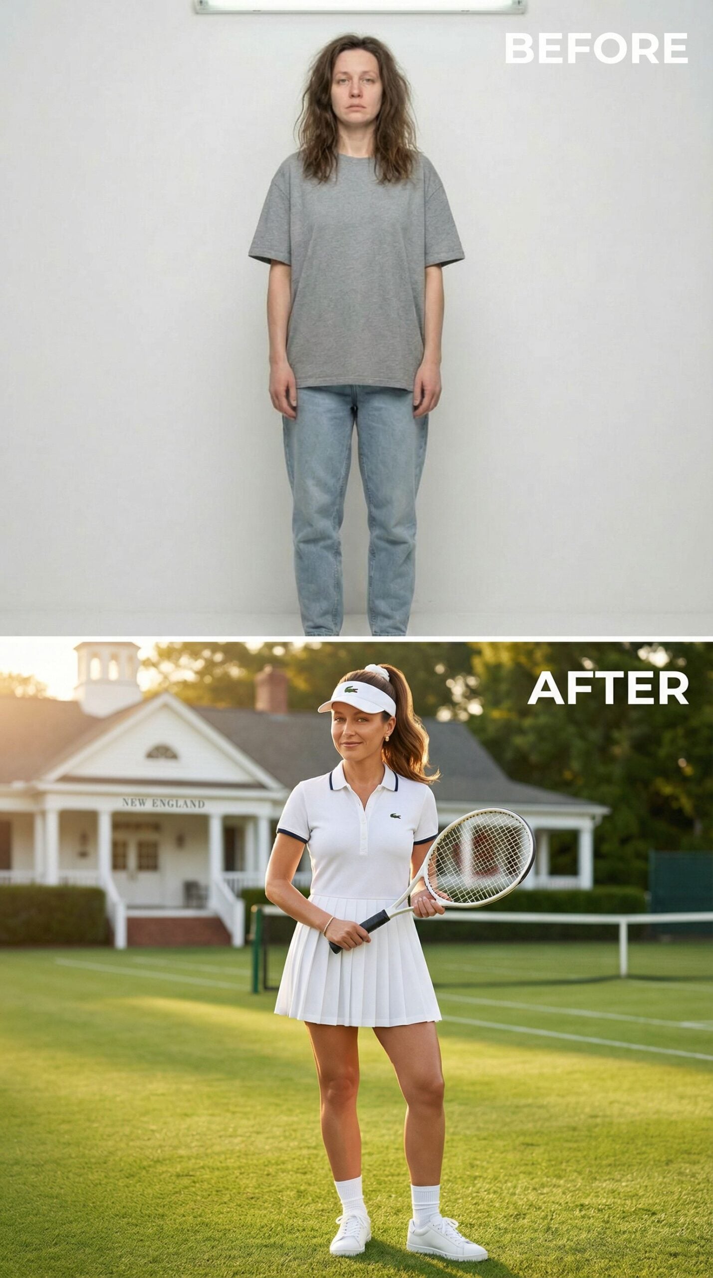 Transform from a 35-year-old woman wearing an Old Money New England outfit to country club royalty with crisp white tennis attire. The pleated skirt and polo shirt combination exudes athletic sophistication, while the visor and tennis racket complete the sporty-chic aesthetic. Golden hour lighting and manicured grounds enhance the luxurious prep school princess vibe that screams exclusive club membership.