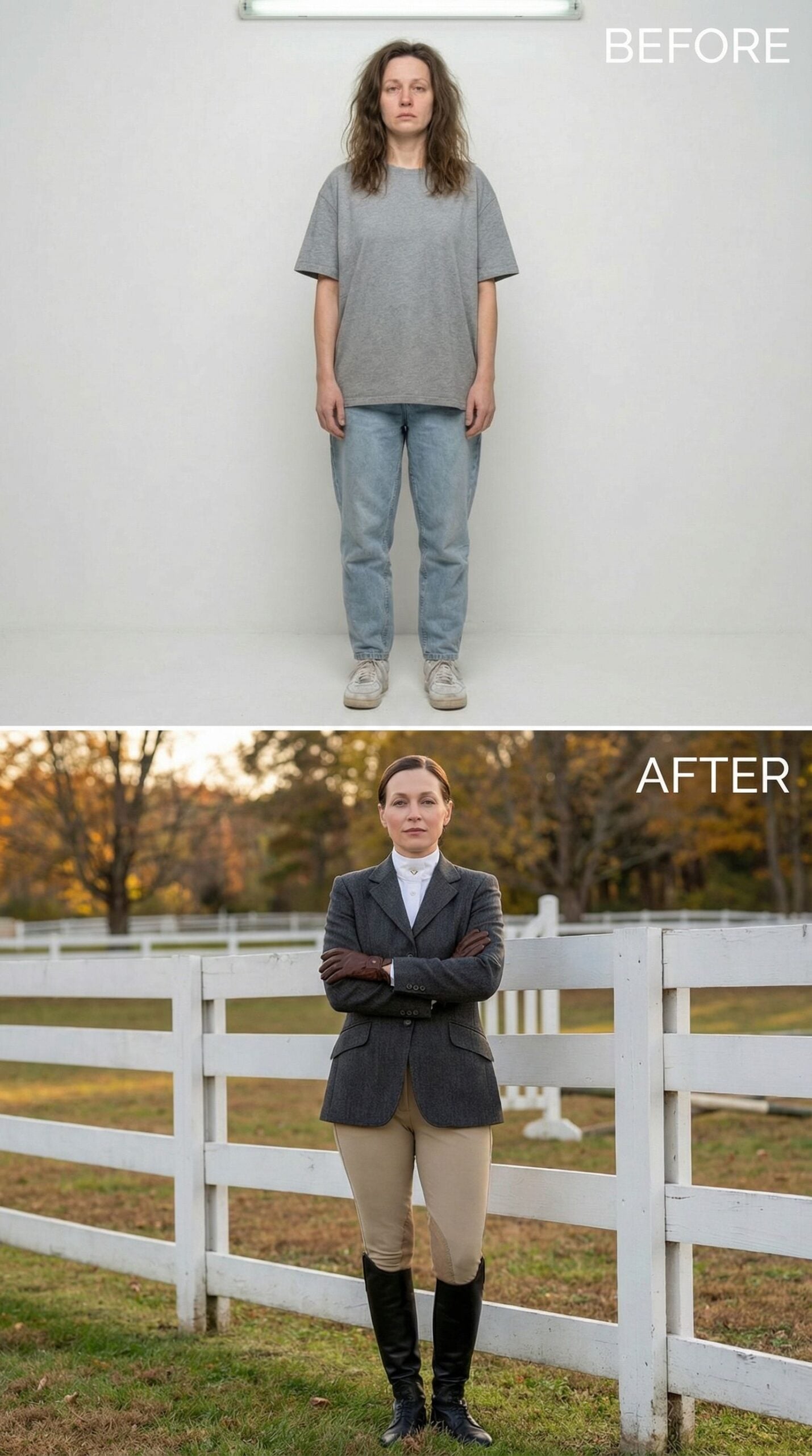 Gray tweed blazer and crisp white blouse transform a 35-year-old woman wearing an Old Money New England outfit into preppy perfection. Tailored riding pants in rich tan create sleek silhouettes while tall black boots add equestrian flair. Arms crossed confidently against autumn’s white fence backdrop, this polished ensemble radiates country club authority and timeless sophistication.