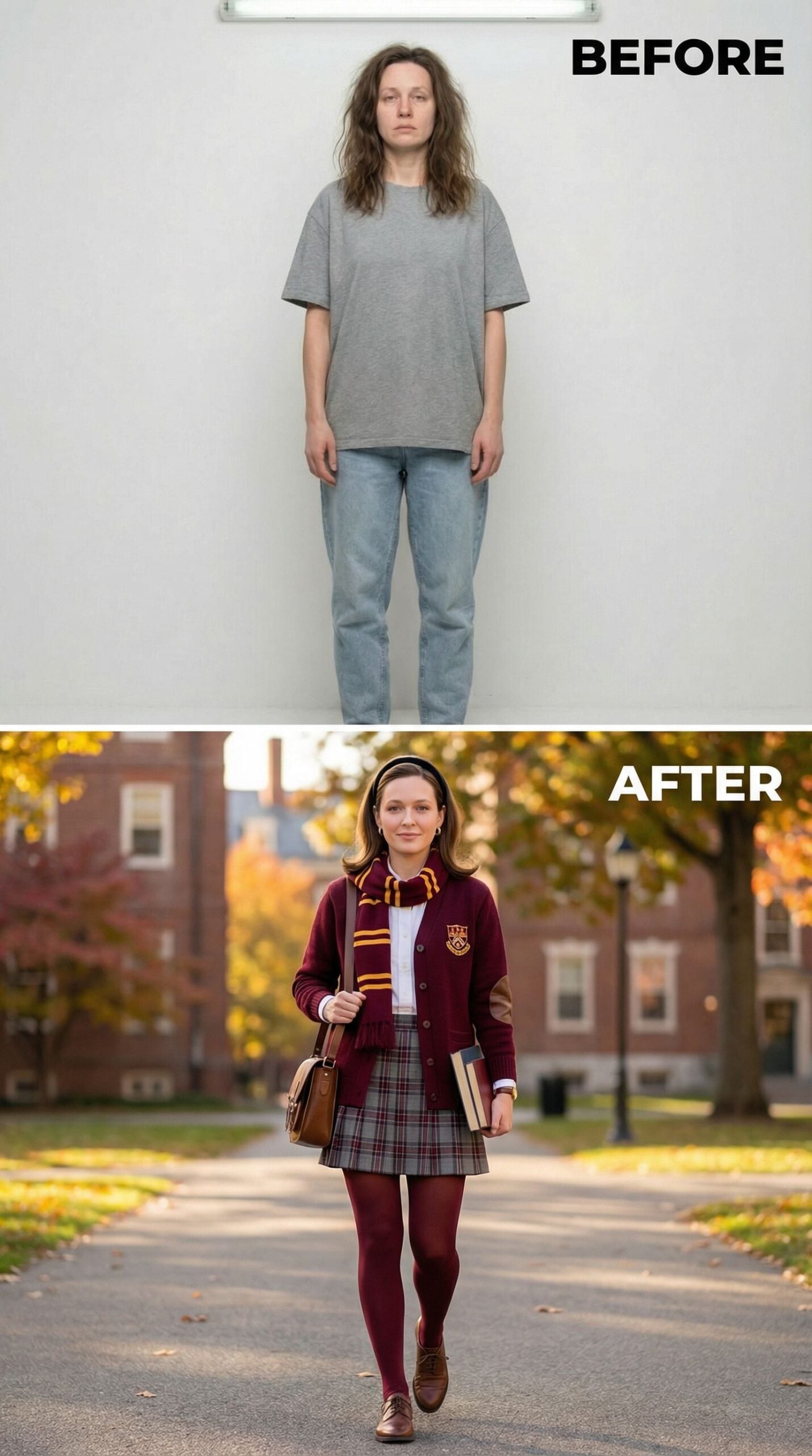 Burgundy cardigan with school crest elevates the transformation from a 35-year-old woman wearing an Old Money New England outfit into preppy perfection. Plaid pleated skirt pairs with matching knee-high socks, while the striped scarf adds authentic collegiate flair. Brown leather loafers and a structured satchel complete this quintessential country club princess look that radiates youthful sophistication and timeless prep school charm.
