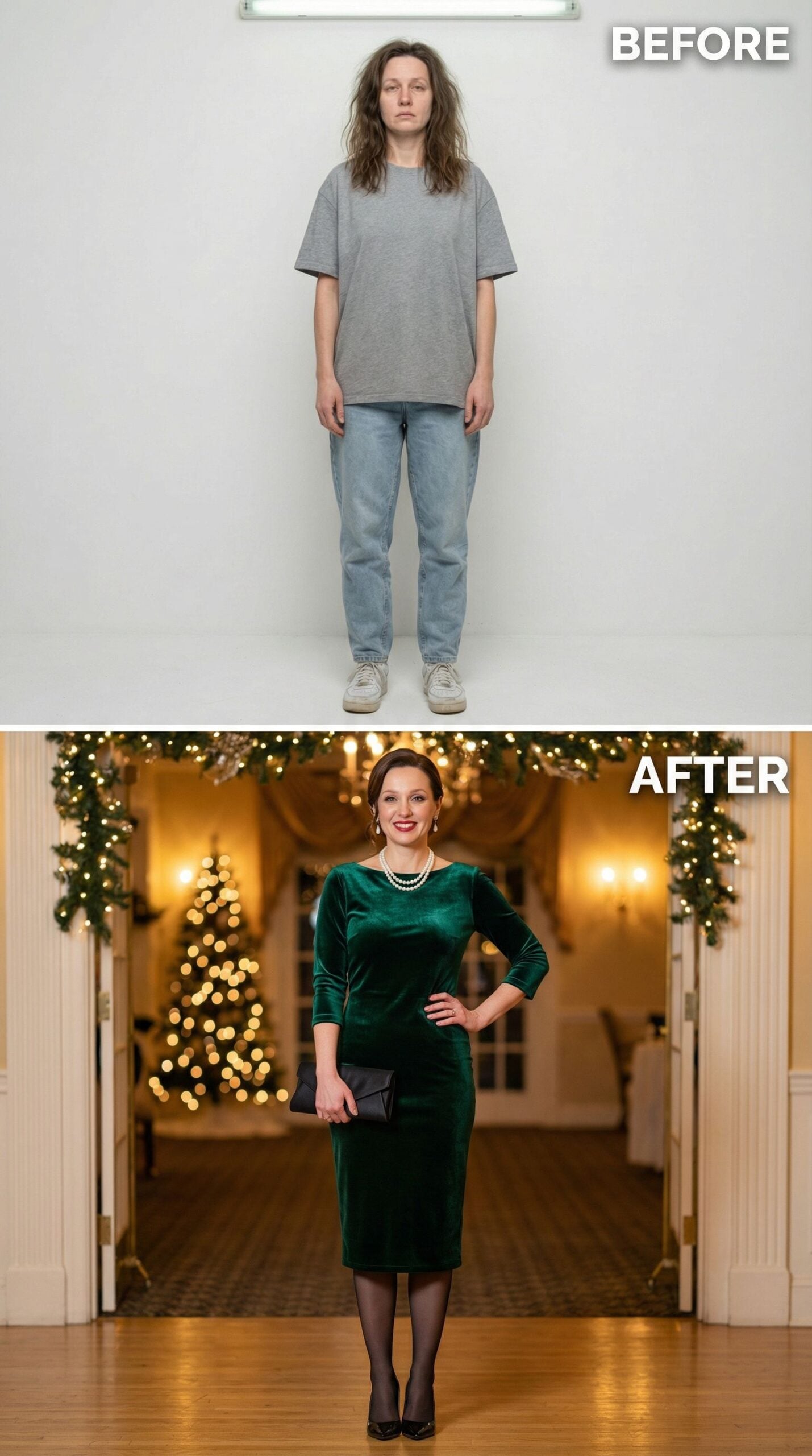 Emerald velvet elevates the 35-year-old woman wearing an Old Money New England outfit into sophisticated holiday territory. The fitted midi dress hugs curves while maintaining refined elegance through its jewel-toned luxury fabric. Pearl accessories and polished styling create an instantly elevated look perfect for upscale seasonal gatherings. Black stockings and heels ground the ensemble with classic finishing touches.