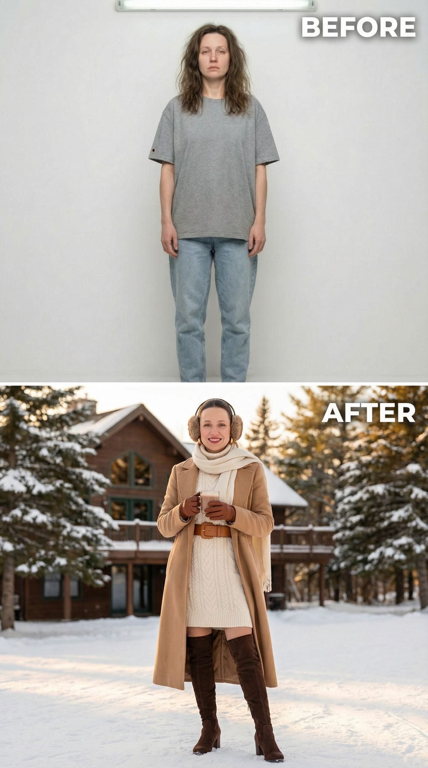 Luxurious camel coat elevates this cozy winter ensemble from basic casual to sophisticated country club elegance. The transformation showcases how a 35-year-old woman wearing an Old Money New England outfit can embrace seasonal glamour with rich textures and warm neutrals. Cable-knit cream dress, cognac leather belt, and suede over-the-knee boots create effortless preppy sophistication perfect for snowy getaways.