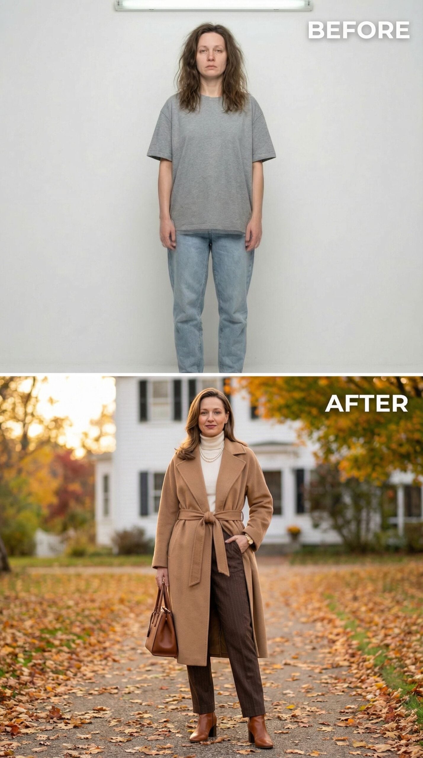 Elevating a 35-year-old woman wearing an Old Money New England outfit into polished autumn elegance requires strategic layering and refined accessories. The camel wrap coat becomes the statement piece, paired with a cream turtleneck and tailored trousers. Cognac leather boots and a structured handbag complete this sophisticated transformation, creating an effortlessly chic look perfect for country club brunches and upscale fall gatherings.