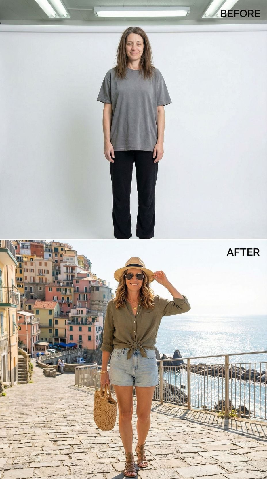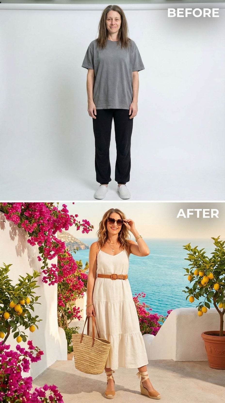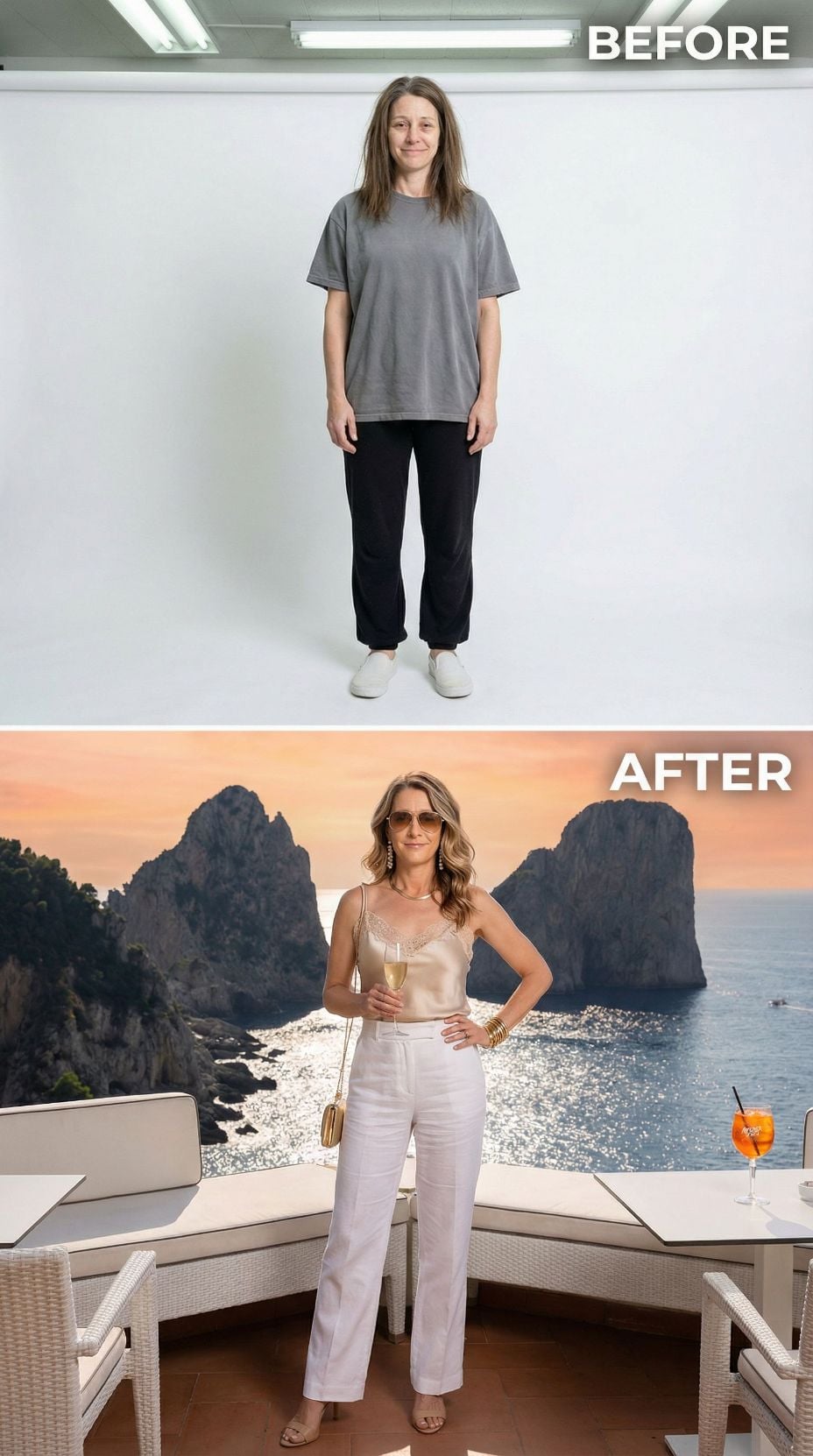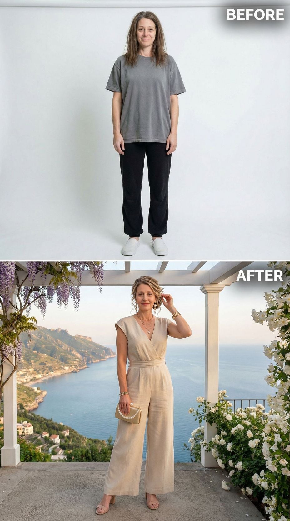 We took one simple self-portrait of a woman in her early 40s. Casual sweats, tousled hair, zero styling—just her most basic, unpolished self. Then we gave AI a very specific brief: transform her into the ultimate Italian coastal fantasy.