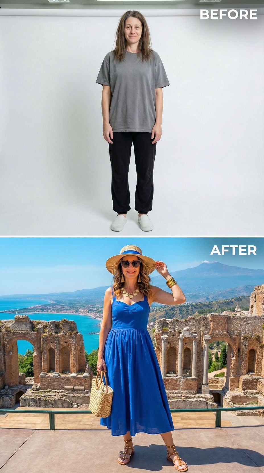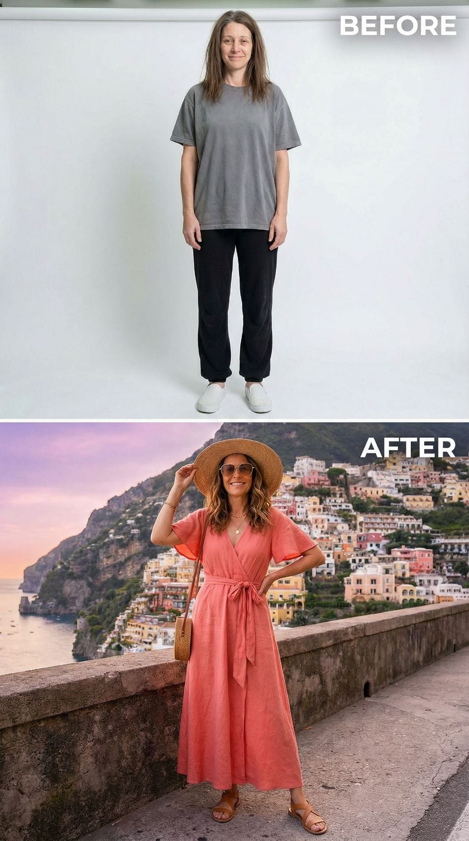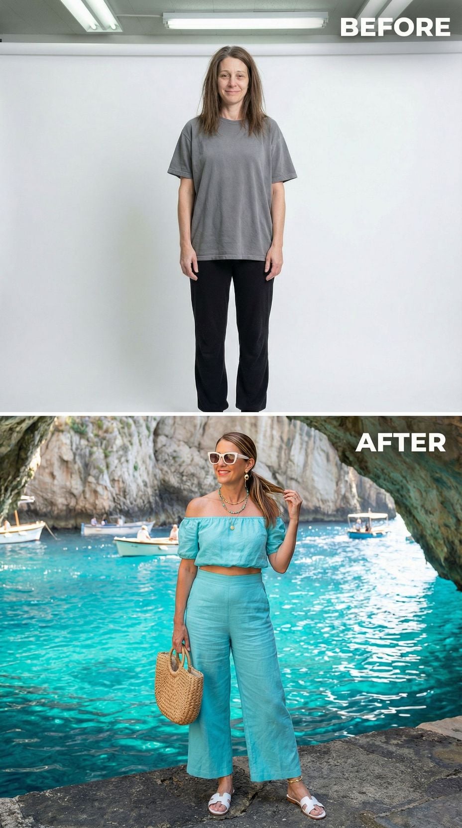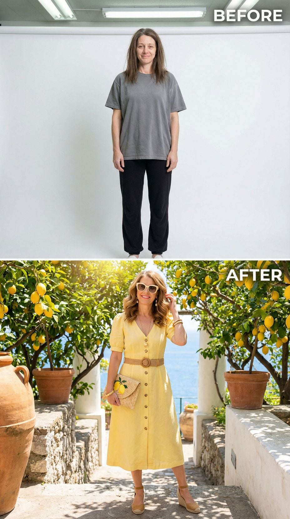 We took one simple self-portrait of a woman in her early 40s. Casual sweats, tousled hair, zero styling—just her most basic, unpolished self. Then we gave AI a very specific brief: transform her into the ultimate Italian coastal fantasy.
