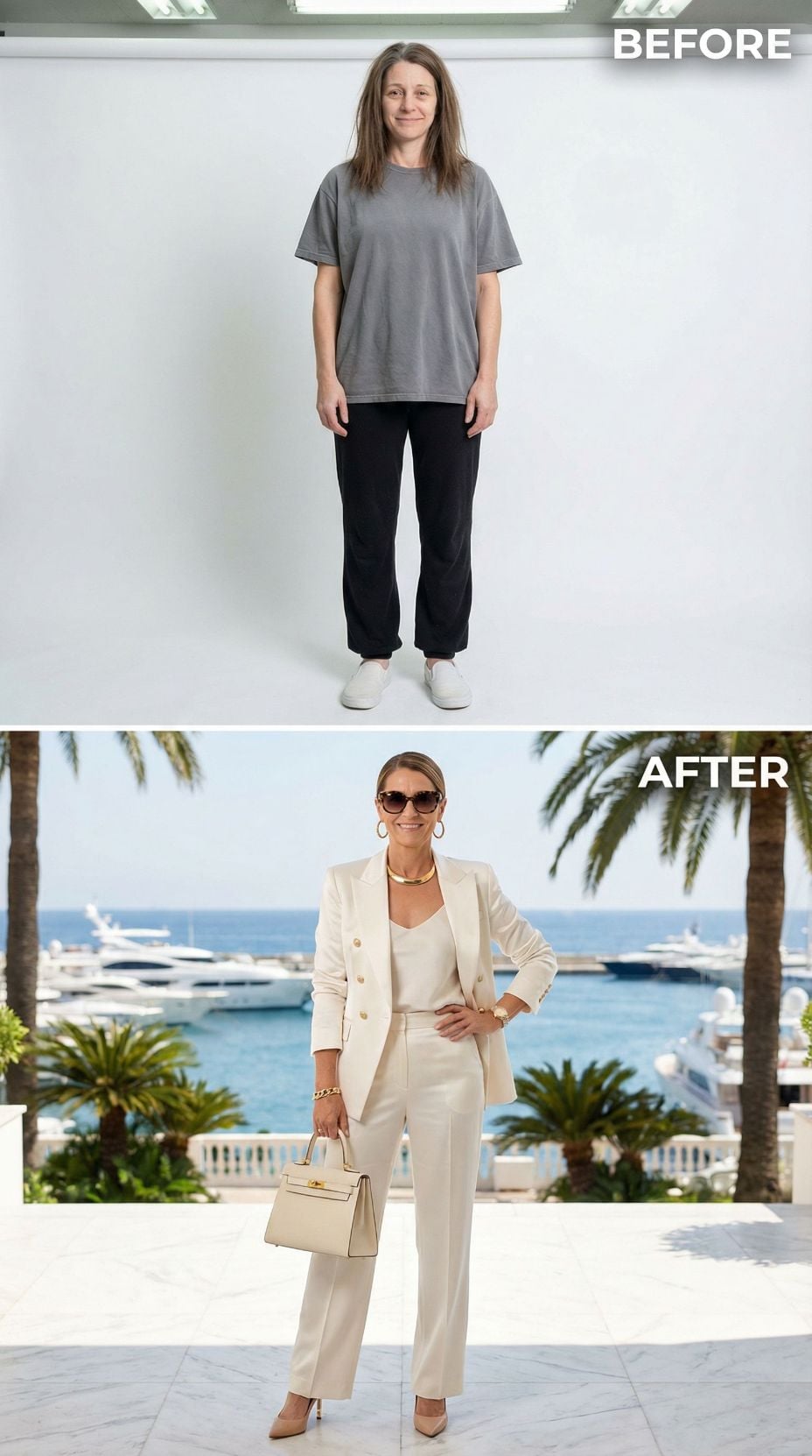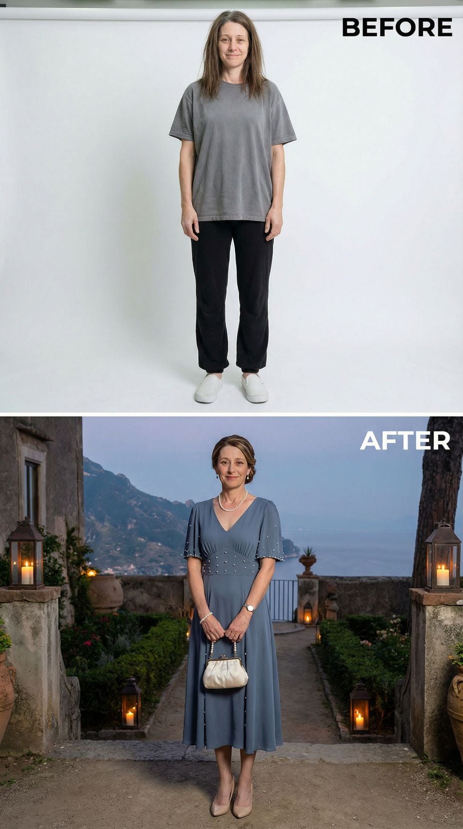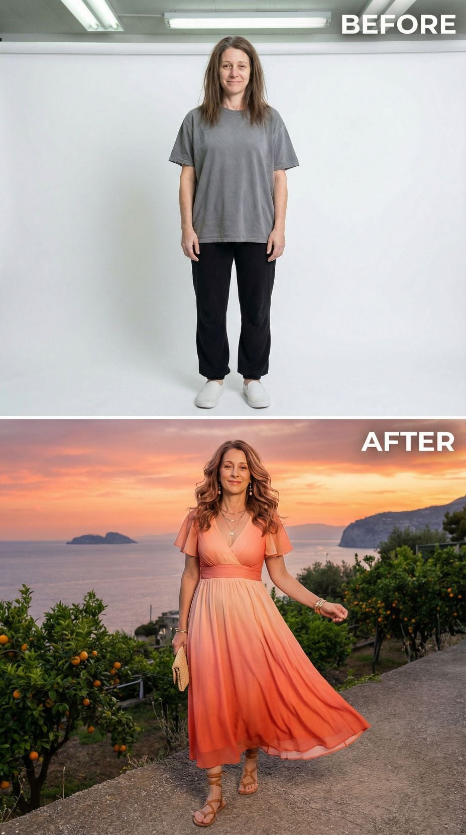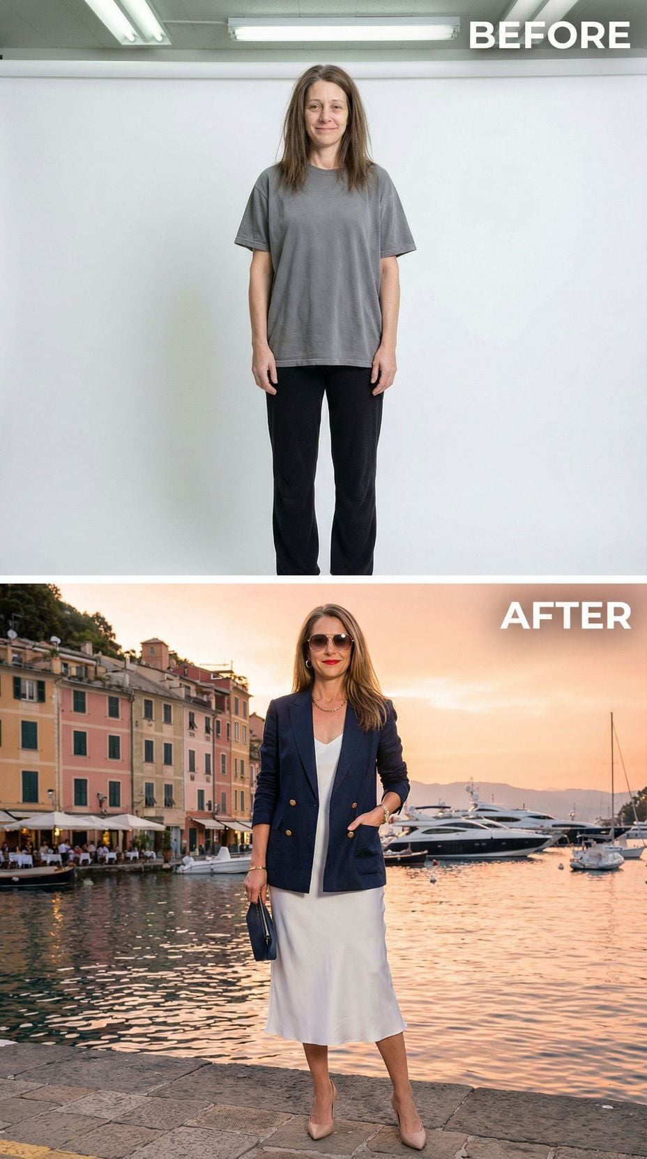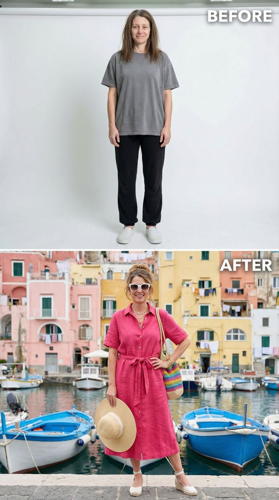We took one simple self-portrait of a woman in her early 40s. Casual sweats, tousled hair, zero styling—just her most basic, unpolished self. Then we gave AI a very specific brief: transform her into the ultimate Italian coastal fantasy.