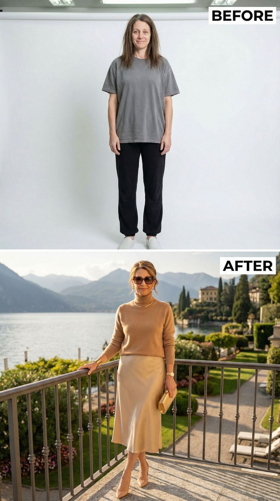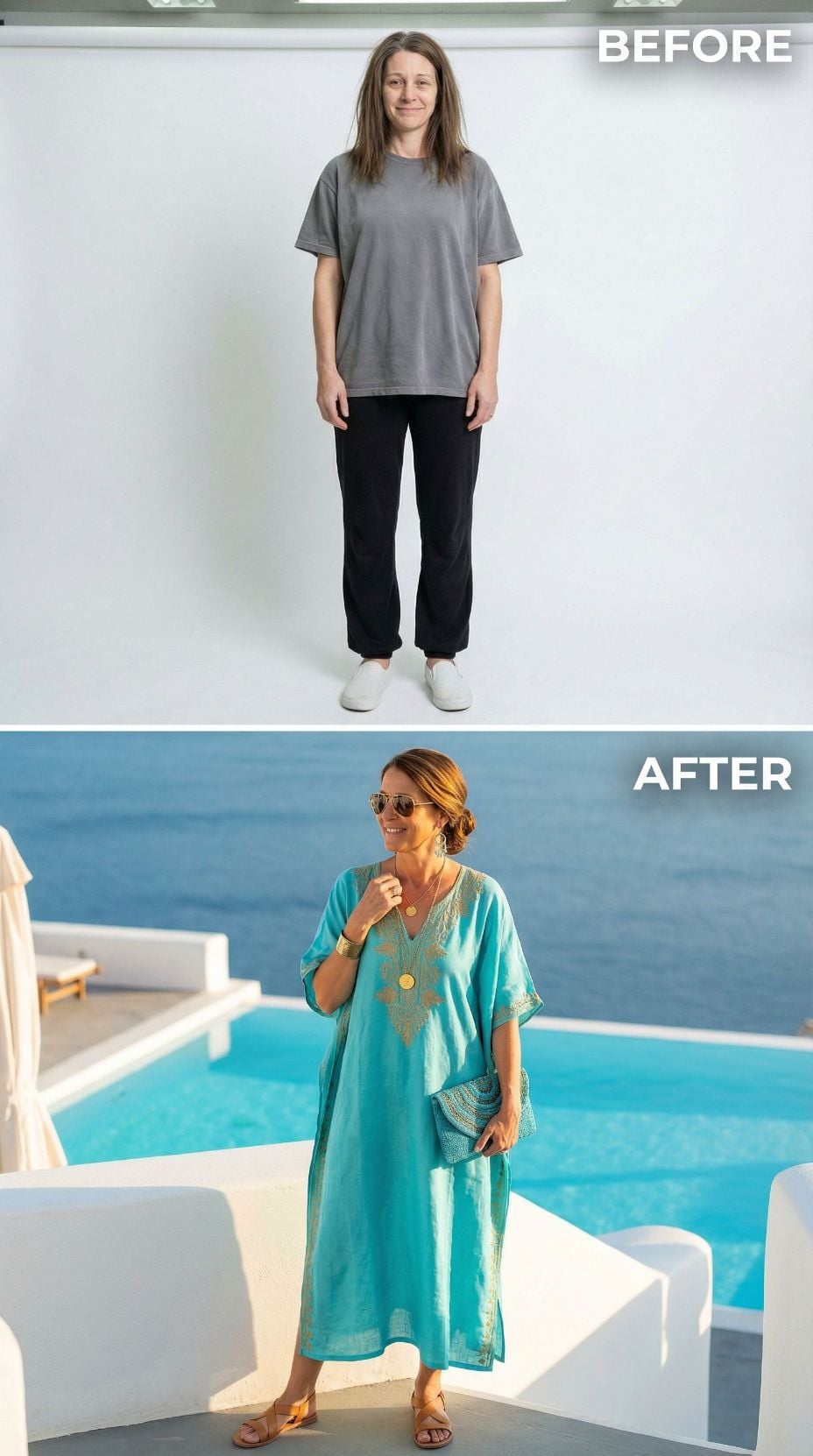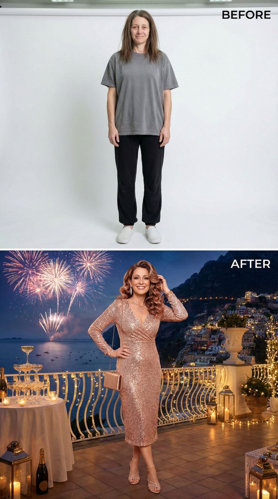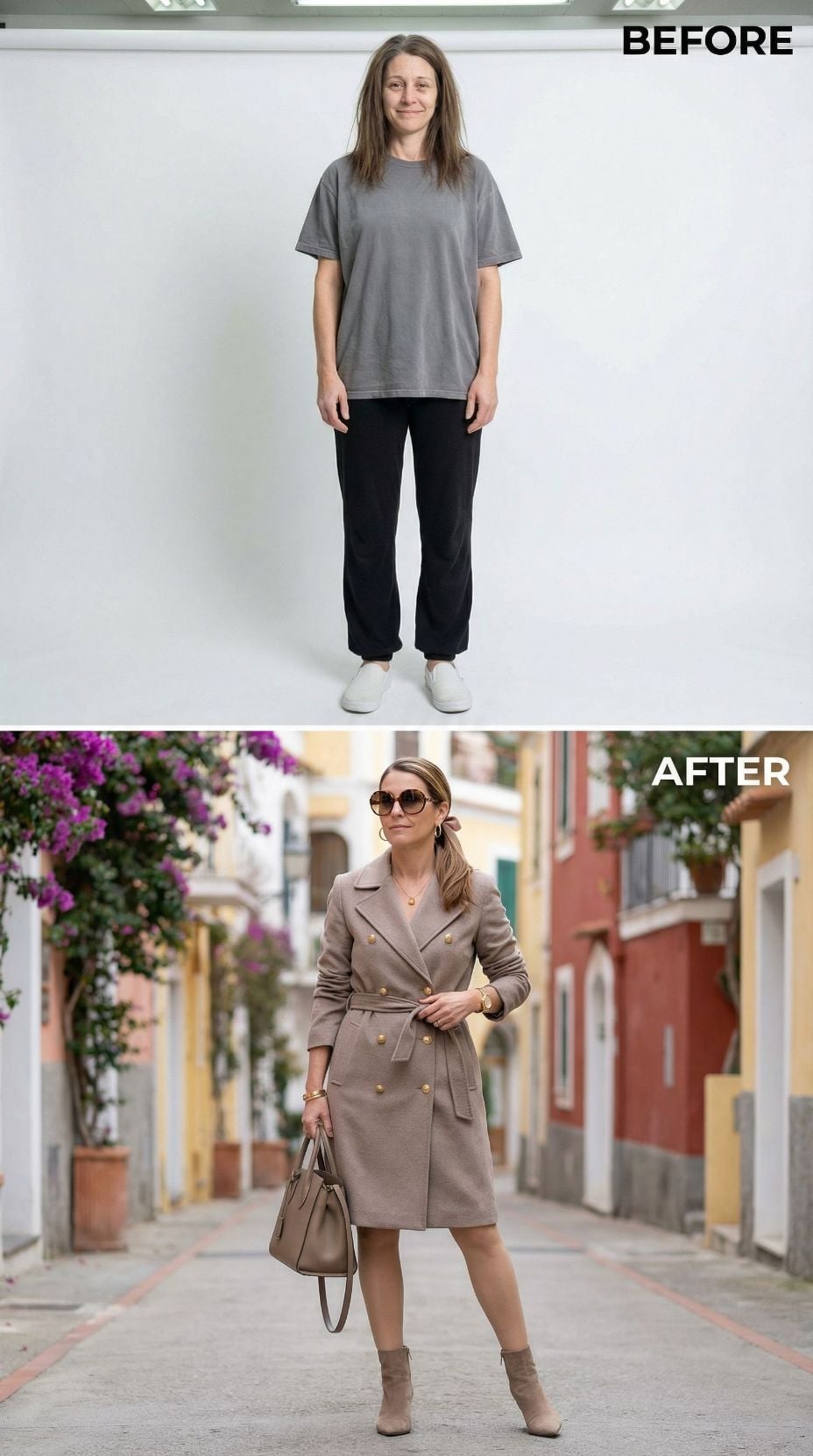 We took one simple self-portrait of a woman in her early 40s. Casual sweats, tousled hair, zero styling—just her most basic, unpolished self. Then we gave AI a very specific brief: transform her into the ultimate Italian coastal fantasy.