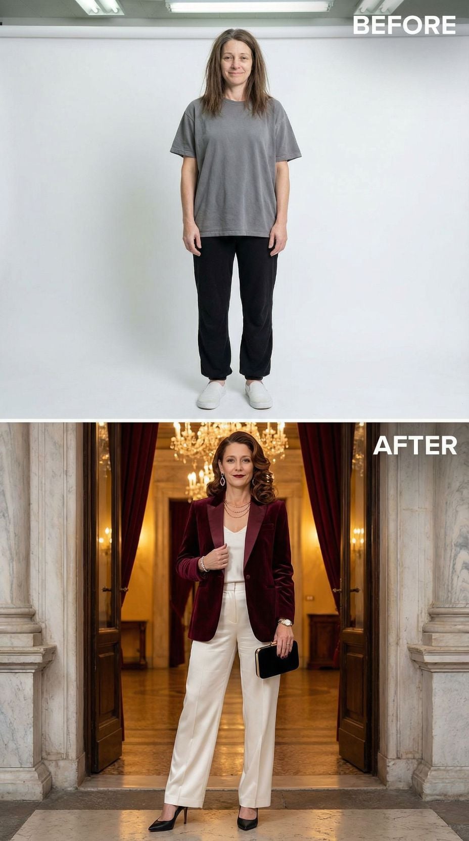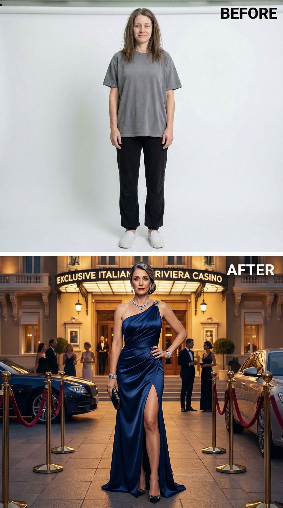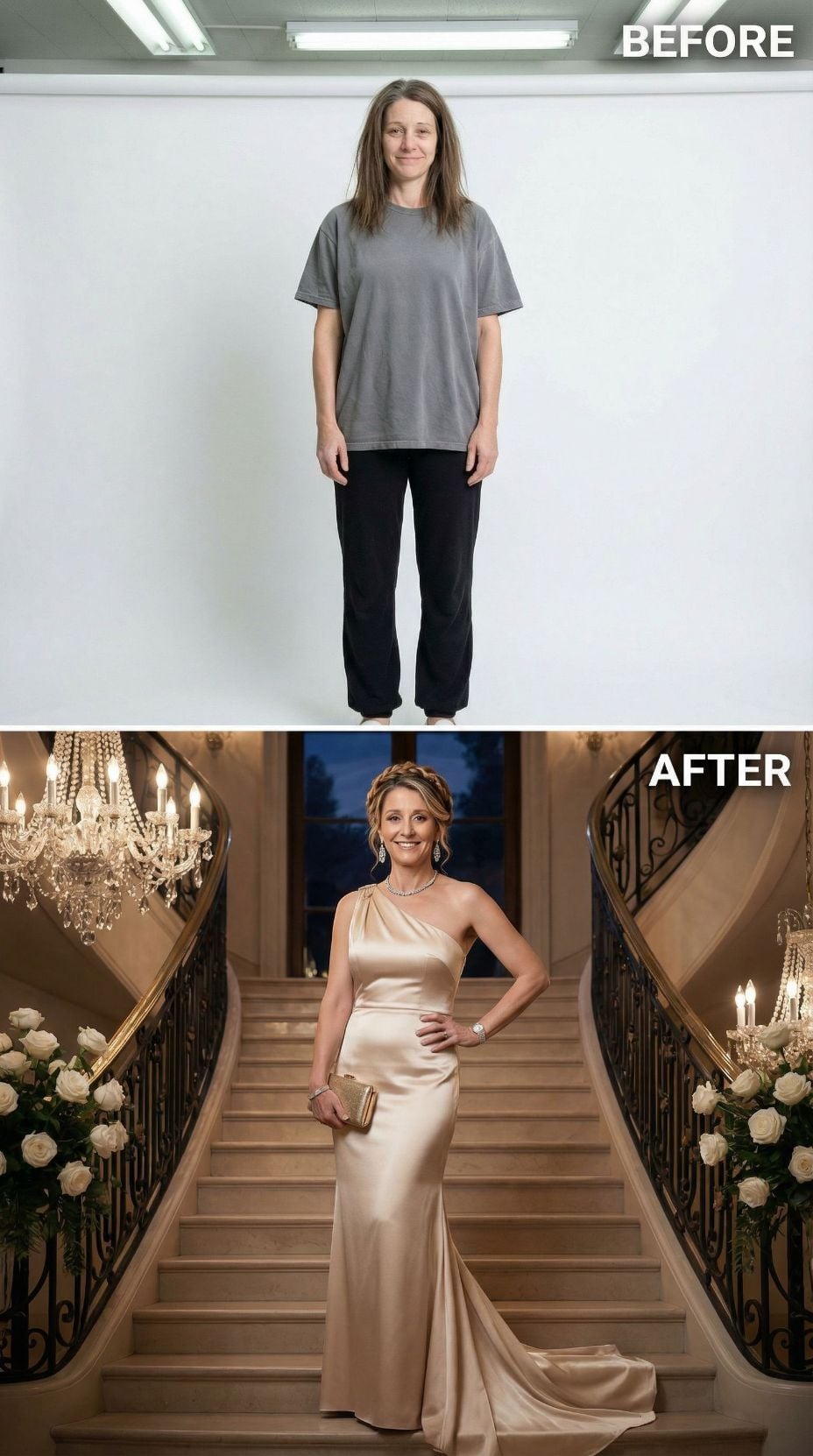Champagne silk transforms this complete makeover into red-carpet perfection. The one-shoulder gown hugs curves beautifully while flowing into an elegant train. Swept-up blonde hair adds sophisticated height, complemented by statement jewelry and a golden clutch. Luxurious staircase setting with crystal chandeliers and white roses creates an opulent backdrop that elevates the entire glamorous transformation.
