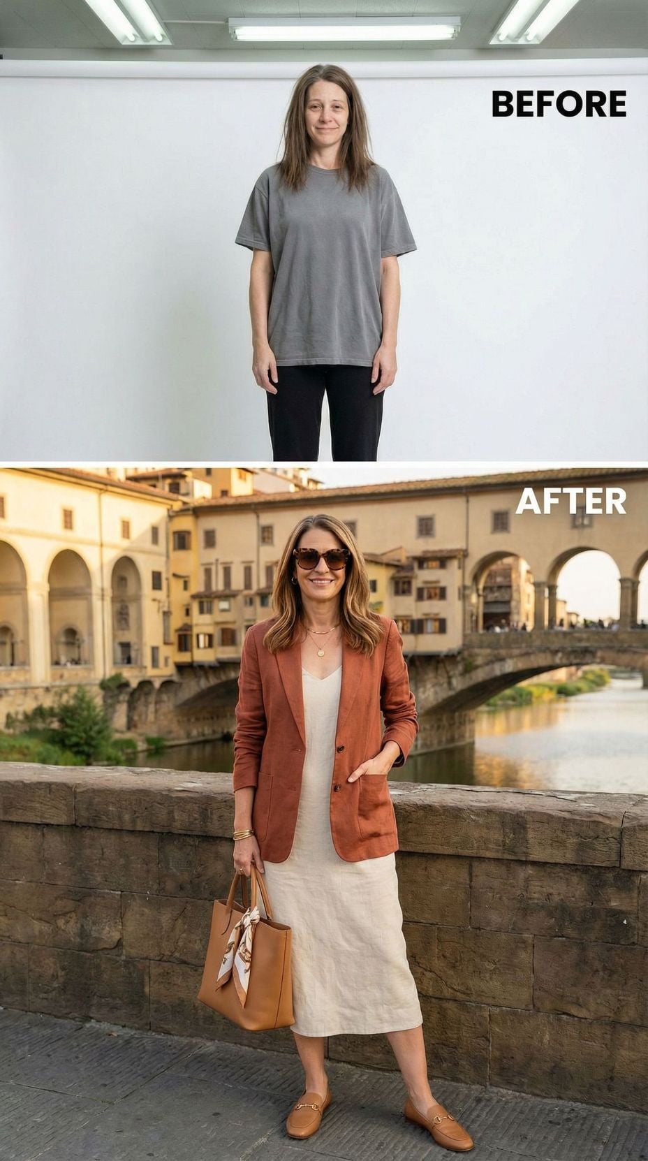 Oversized grey cotton transforms into sophisticated Italian elegance with strategic styling. The rust-colored blazer creates structure while the cream midi dress flows beautifully against Florence’s historic backdrop. Tortoiseshell sunglasses and cognac leather accessories complete this effortless coastal summer aesthetic. Warm blonde highlights frame her face perfectly, elevating the entire look from basic to breathtakingly chic.