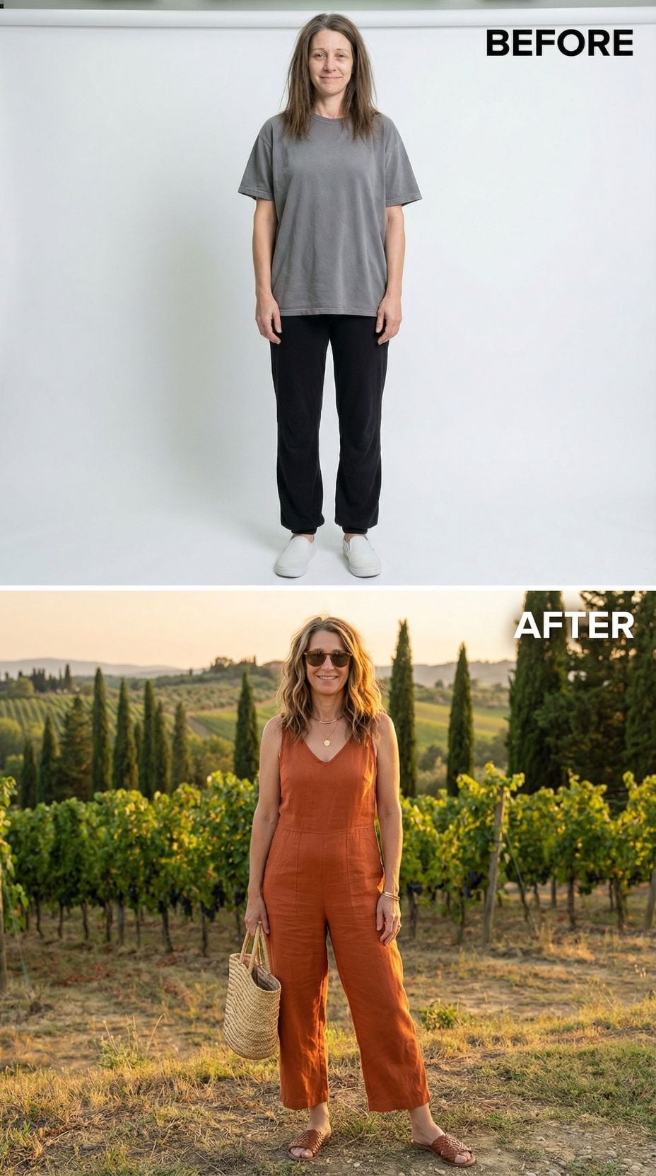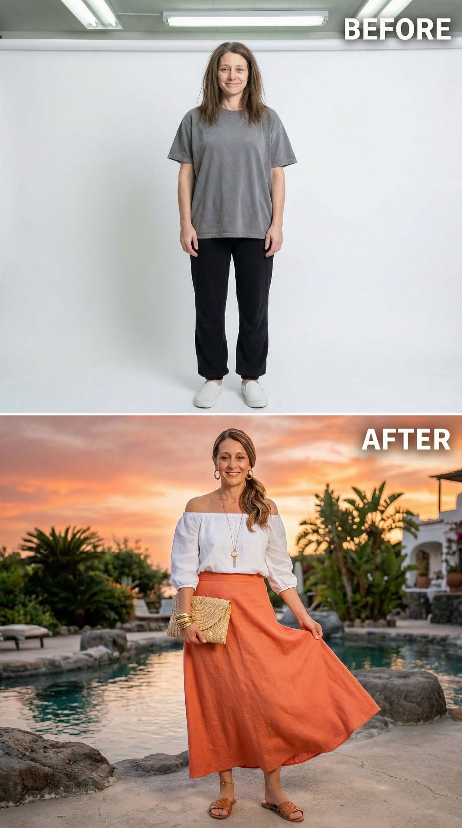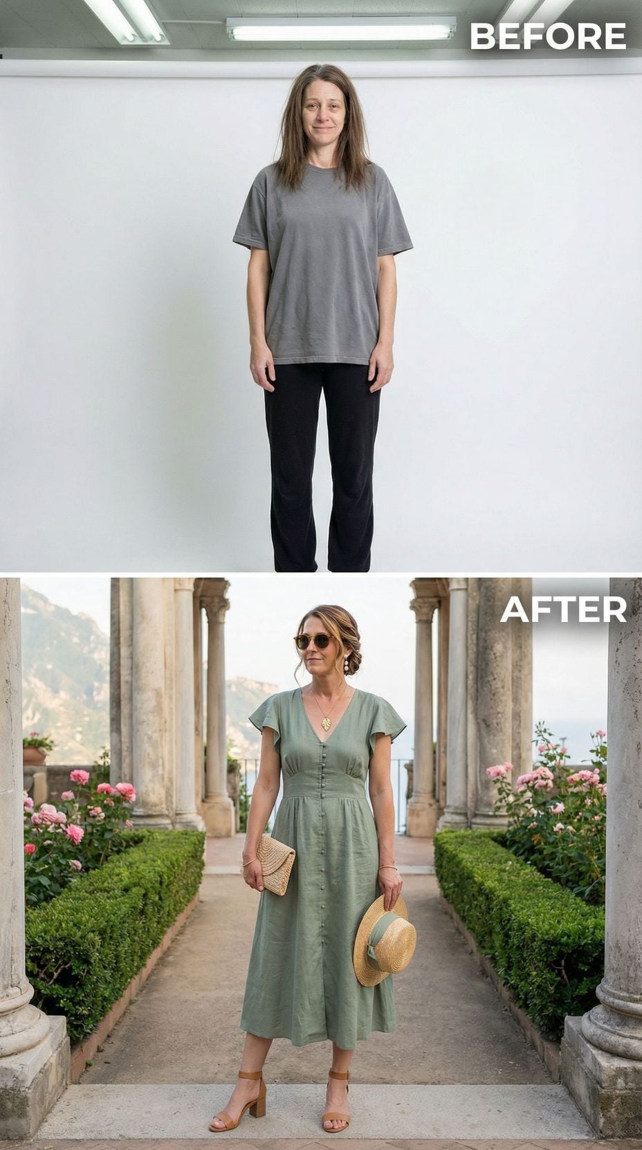 Sage green transforms everything in this stunning makeover. The button-front midi dress with flutter sleeves creates an effortlessly romantic silhouette, while the styled updo and golden accessories add sophisticated polish. Woven clutch and block heel sandals complete the coastal Italian aesthetic. This elevated look proves how the right dress and styling can create a complete transformation from basic separates to vacation-ready elegance.