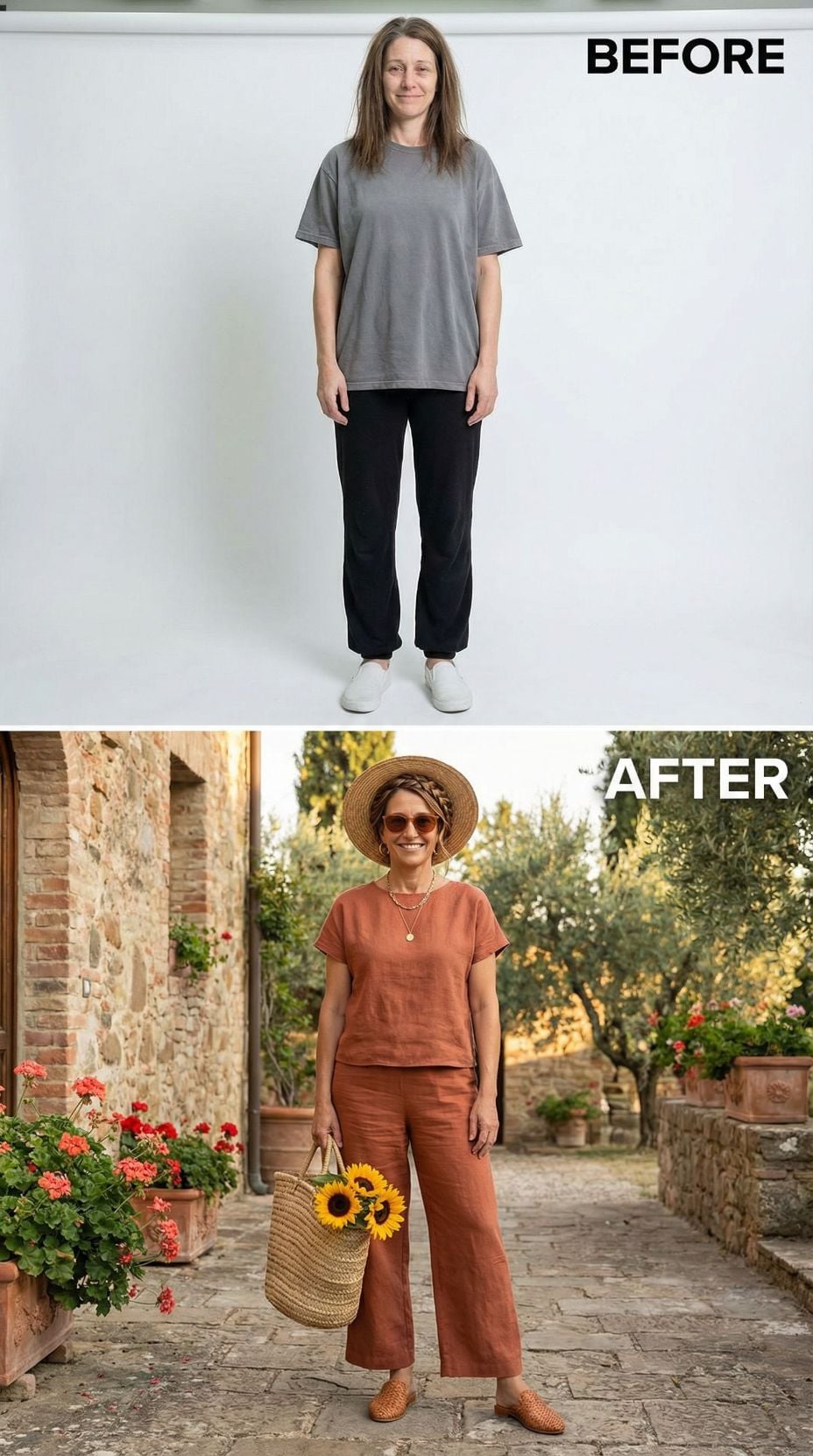 Rust-colored linen coordinates replace the simple looking 42 year old woman in plain clothes aesthetic with effortless Mediterranean sophistication. The matching top and wide-leg trousers create a cohesive silhouette that feels both relaxed and refined. Woven accessories including a structured sun hat, basket bag filled with sunflowers, and braided flats complete this Italian coastal transformation. Layered gold jewelry adds subtle glamour to the earthy palette.