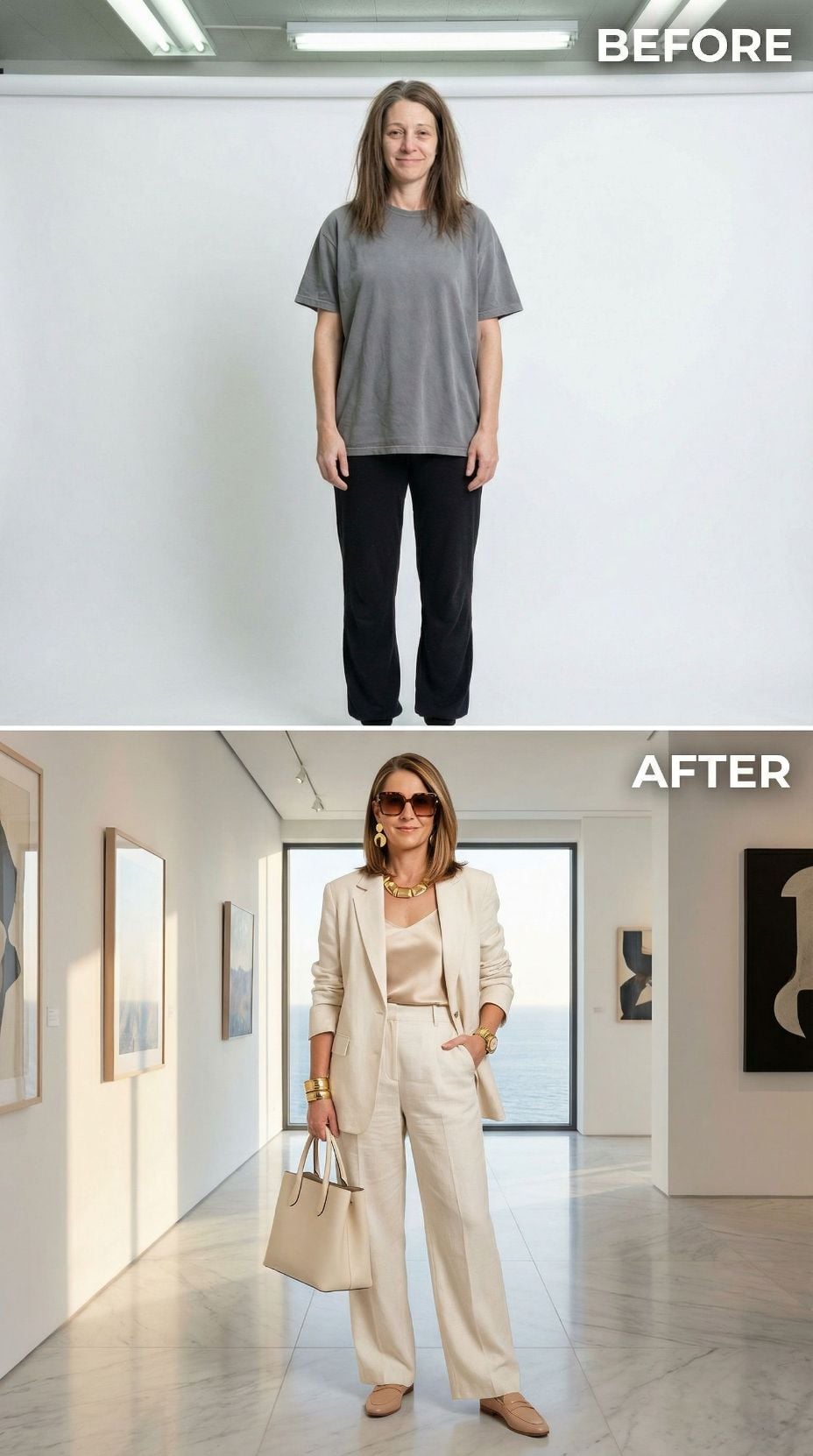 Cream linen becomes your passport to coastal sophistication in this stunning transformation. The tailored blazer and wide-leg trousers create an effortlessly chic silhouette, while gold jewelry and oversized sunglasses add luxurious finishing touches. Neutral tones work harmoniously to elevate the simple looking 42 year old woman in plain clothes into Mediterranean glamour that’s perfect for upscale seaside destinations.