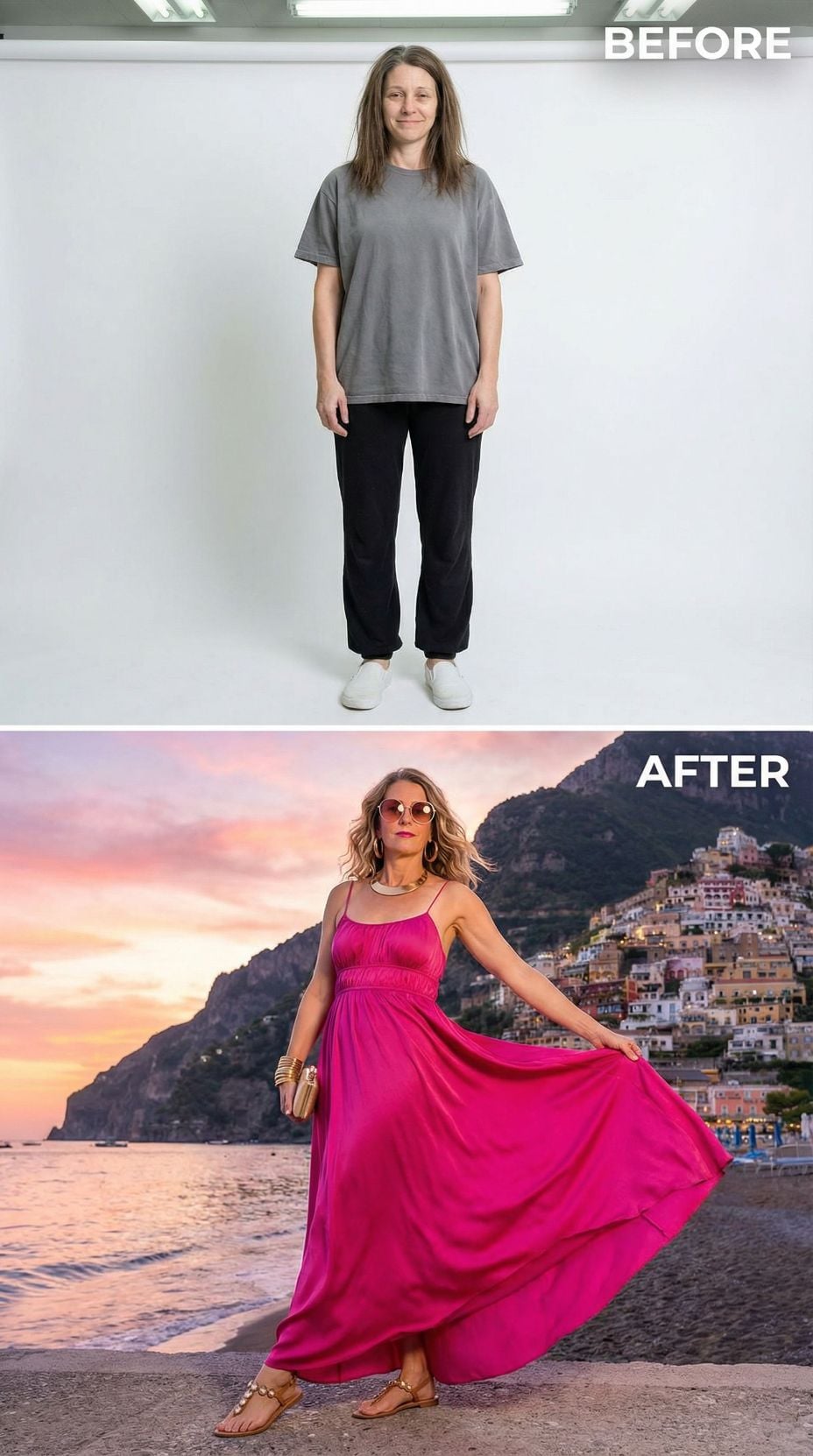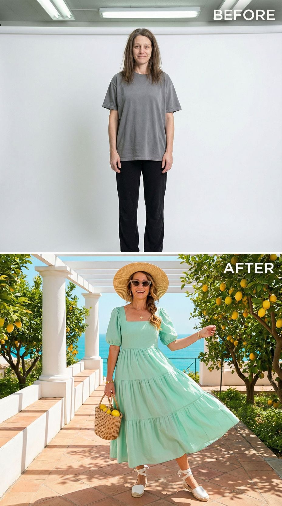 The results? 35 breathtaking looks straight out of an Amalfi Coast daydream. Breezy linen sundresses, espadrille wedges, oversized sunglasses, sun-kissed glowing skin, and those effortless beachy waves. Same face, completely different energy. She went from lounging at home to sipping Aperol Spritz on a Positano terrace in seconds. The glow-up is giving Monica Bellucci in golden hour, and honestly? We’re ready to book a flight immediately.