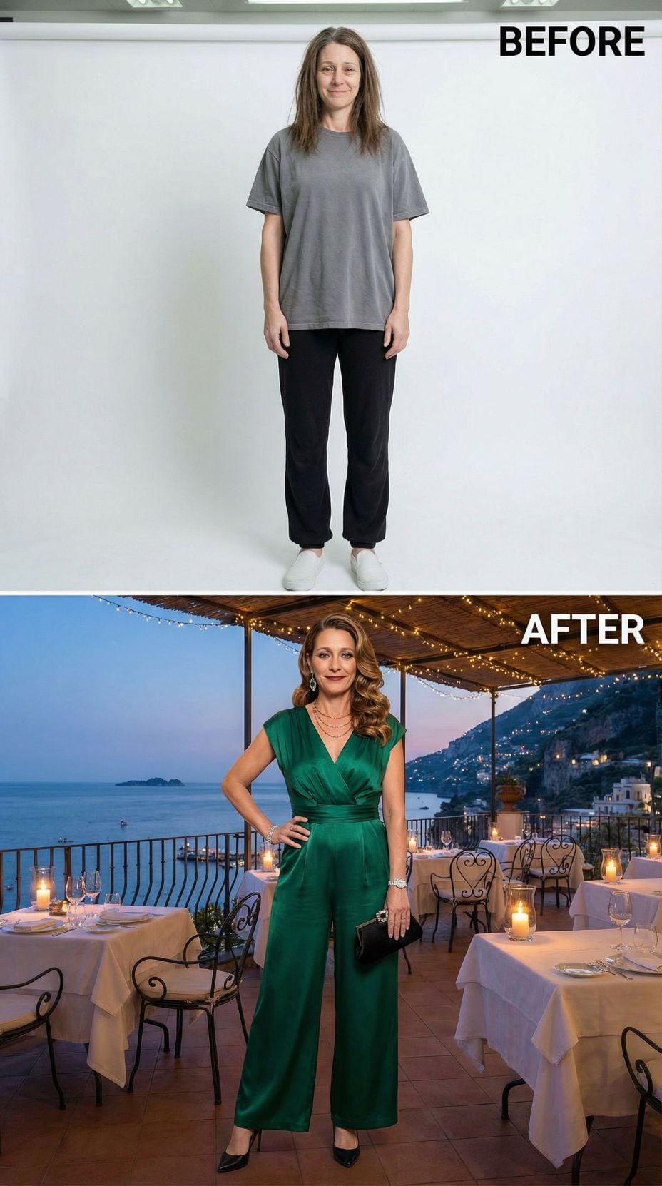 Emerald silk elevates this transformation from simple looking 42 year old woman in plain clothes into pure Italian Riviera elegance. The wrap-style jumpsuit creates flowing lines while the rich green shade mirrors coastal waters at sunset. Voluminous waves replace straight hair, adding movement and luxury. Gold jewelry layers beautifully against the jewel tone, while black heels ground the look with sophisticated polish perfect for seaside dining.