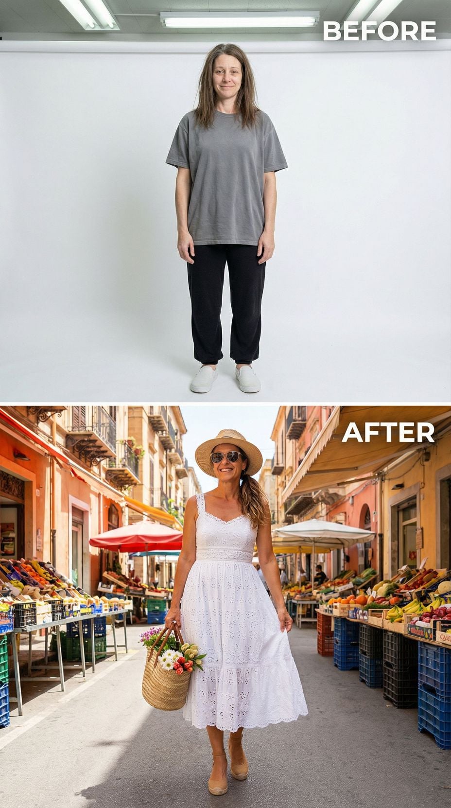 White eyelet midi dress becomes the star of this coastal transformation, paired with woven sun hat and aviator sunglasses for effortless European elegance. The flowing silhouette and delicate cutwork details create romantic femininity, while neutral espadrilles ground the look perfectly. Wicker basket and Italian market backdrop complete this stunning evolution from simple looking 42 year old woman in plain clothes to sophisticated summer wanderer.