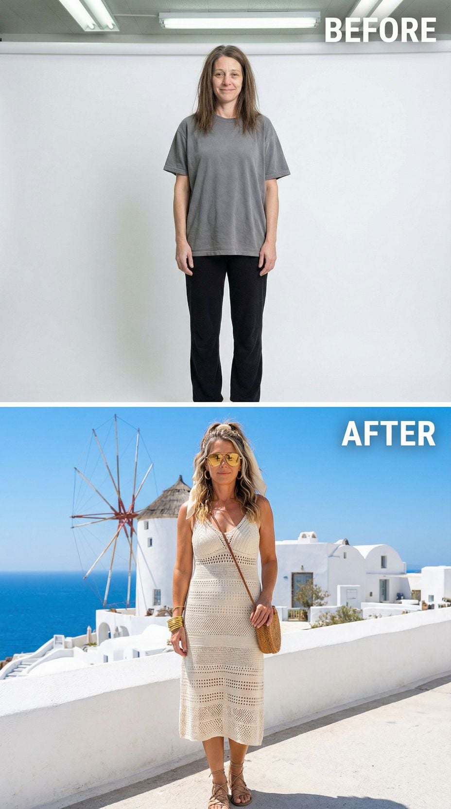 Flowing blonde waves and a cream crochet midi dress completely revolutionize this transformation. The halter-style silhouette highlights sun-kissed skin while maintaining elegant coverage. Yellow-tinted sunglasses add retro glamour, and strappy nude sandals elongate the legs. A woven crossbody bag provides practical Mediterranean charm. This coastal-inspired look captures effortless summer sophistication against stunning white architecture.