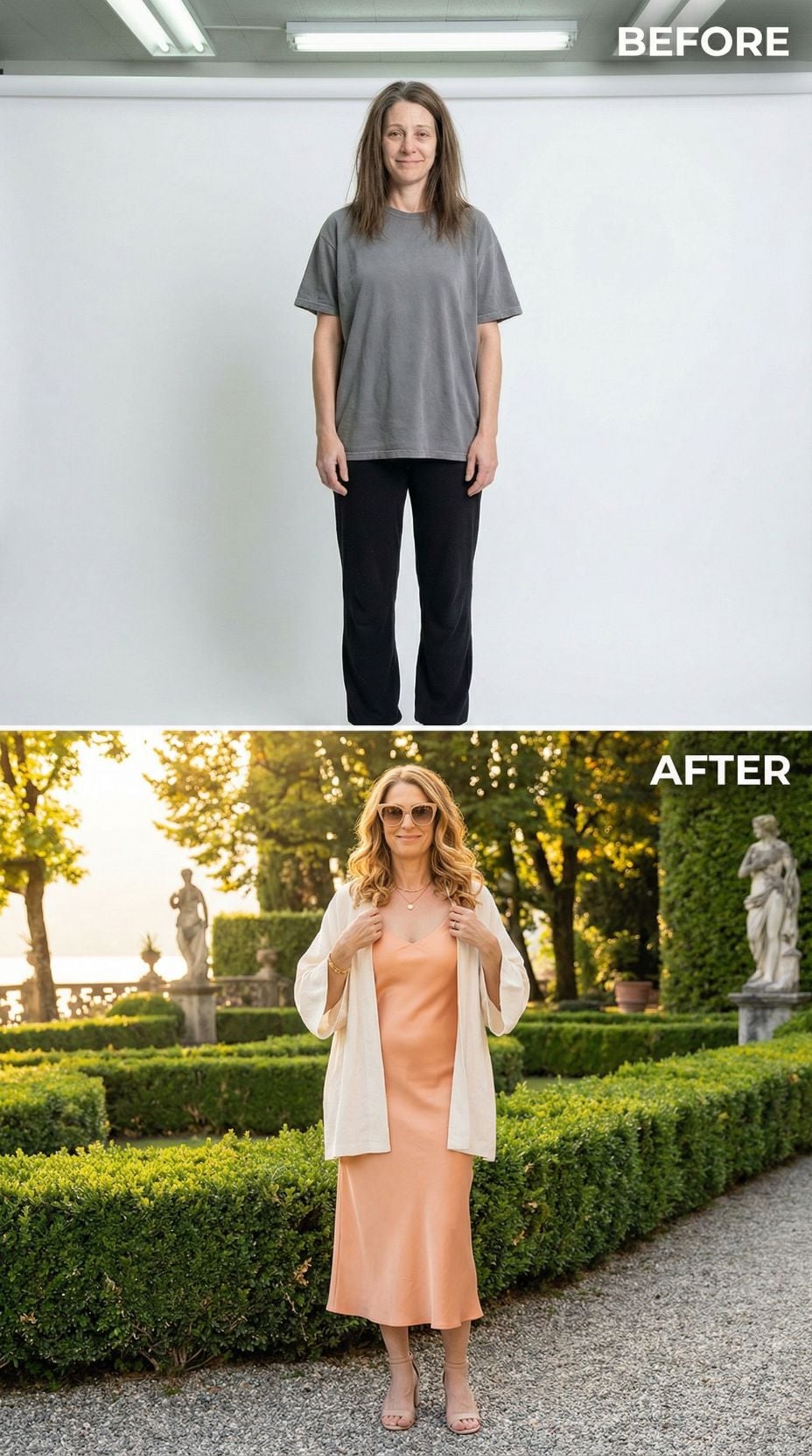 Peachy silk slip dress creates instant Mediterranean elegance when paired with a flowing cream linen blazer. The golden blonde waves catch sunlight beautifully while oversized sunglasses add sophisticated mystery. Nude strappy sandals elongate the silhouette perfectly. This transformation proves how luxurious fabrics and warm tones can elevate any simple starting point into pure Italian coastal glamour worthy of villa gardens.