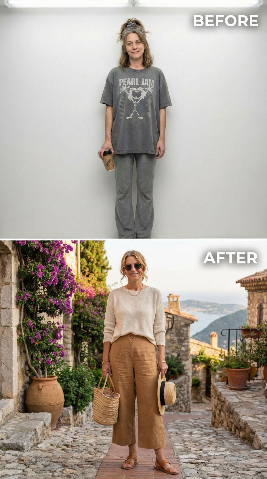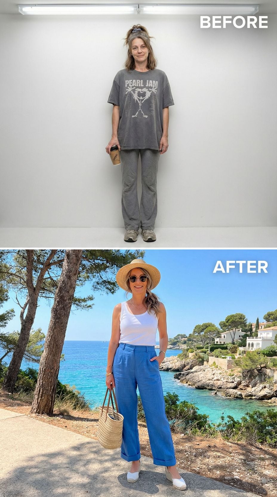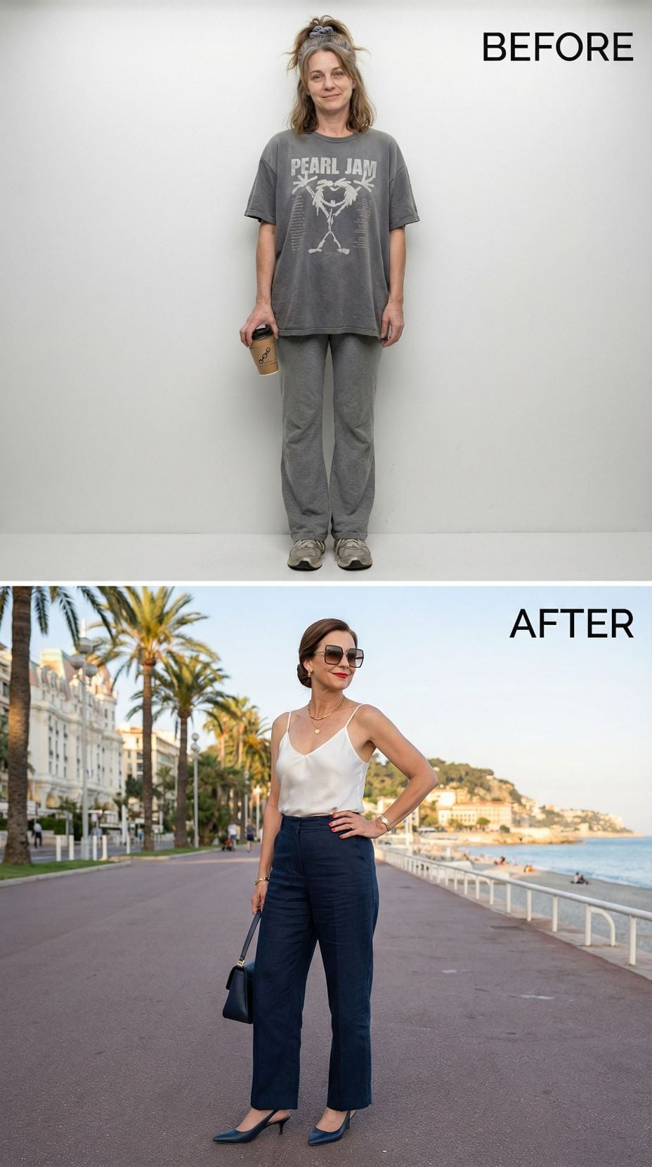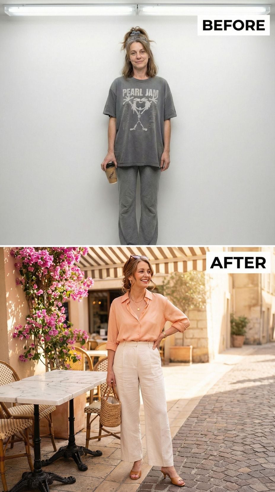 Pearl Jam concert tees transform into Mediterranean sophistication with this stunning makeover. The coral silk camisole paired with crisp white wide-leg trousers creates effortless French Riviera elegance. Layered gold jewelry and tortoiseshell sunglasses add luxurious finishing touches. White leather accessories and strappy sandals complete this transformation from stressed 43 year old mom in casual comfort wear to coastal chic perfection.