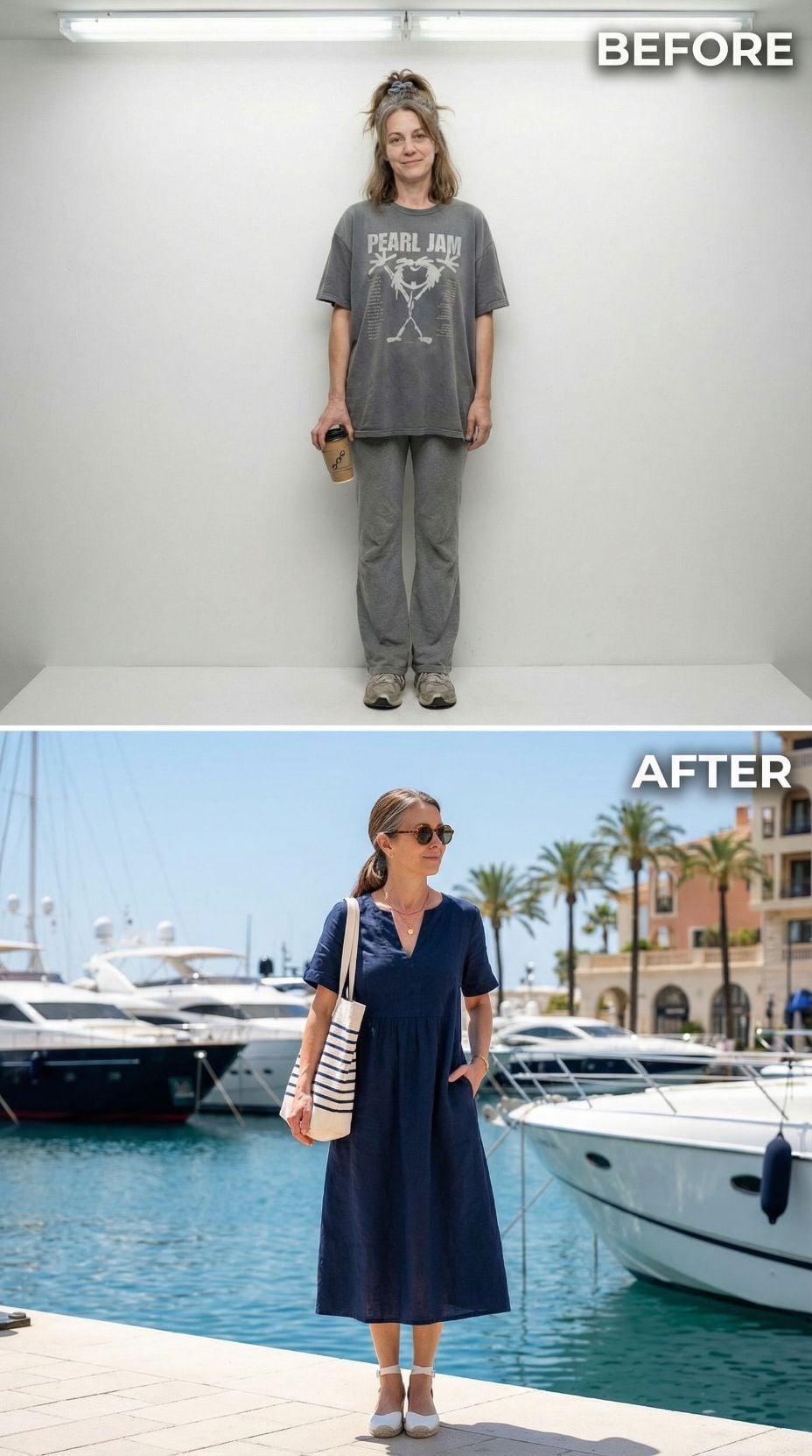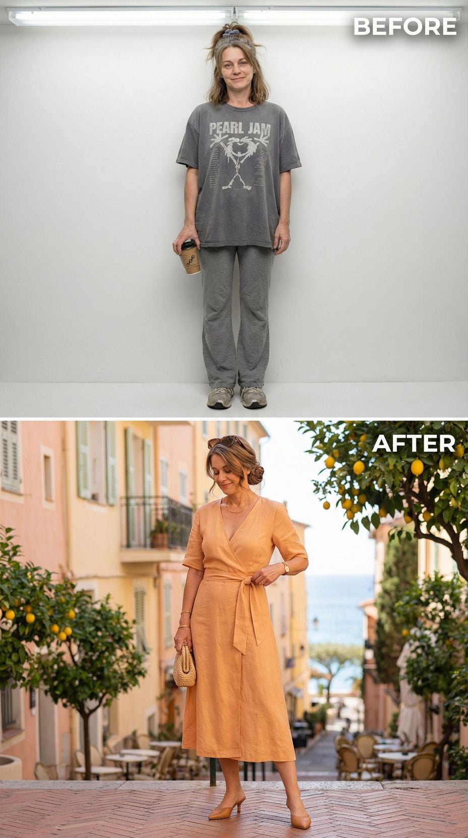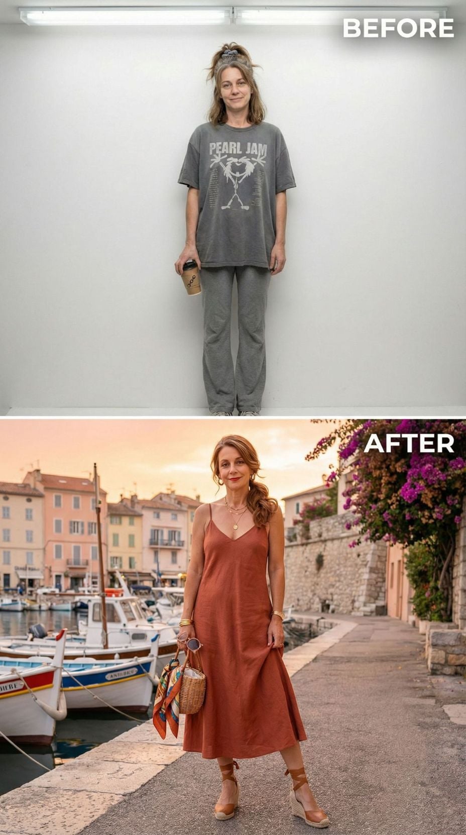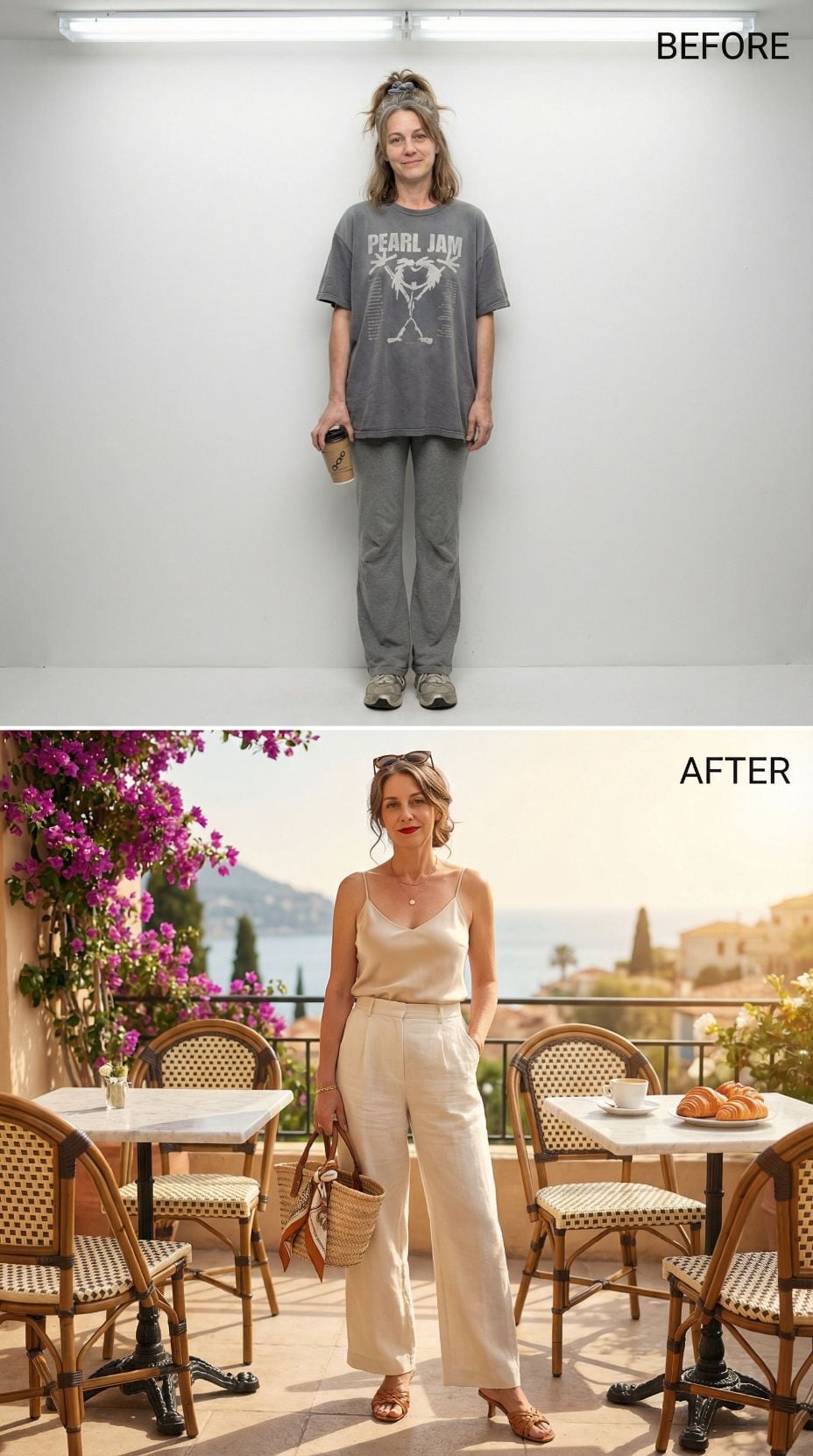 Pearl Jam concert tees transform into Mediterranean sophistication with this stunning makeover. The coral silk camisole paired with crisp white wide-leg trousers creates effortless French Riviera elegance. Layered gold jewelry and tortoiseshell sunglasses add luxurious finishing touches. White leather accessories and strappy sandals complete this transformation from stressed 43 year old mom in casual comfort wear to coastal chic perfection.