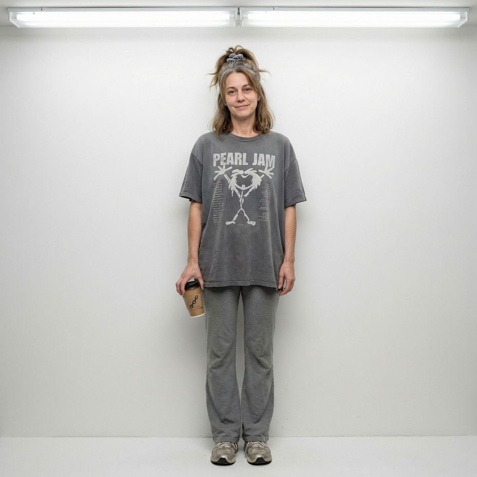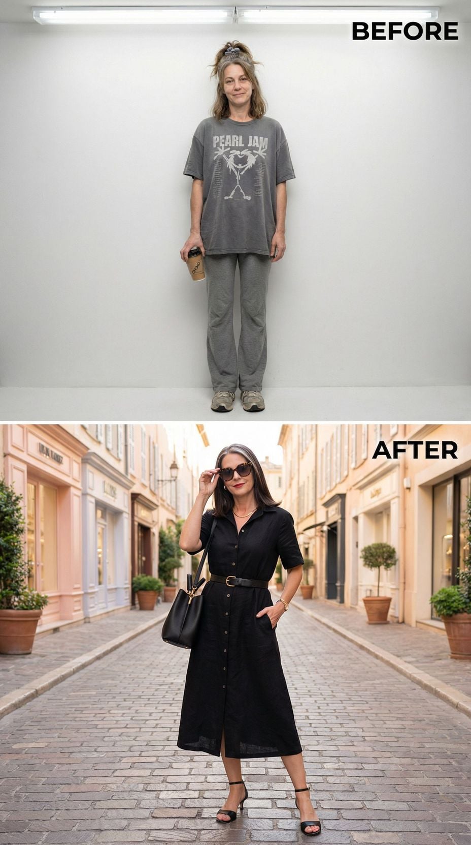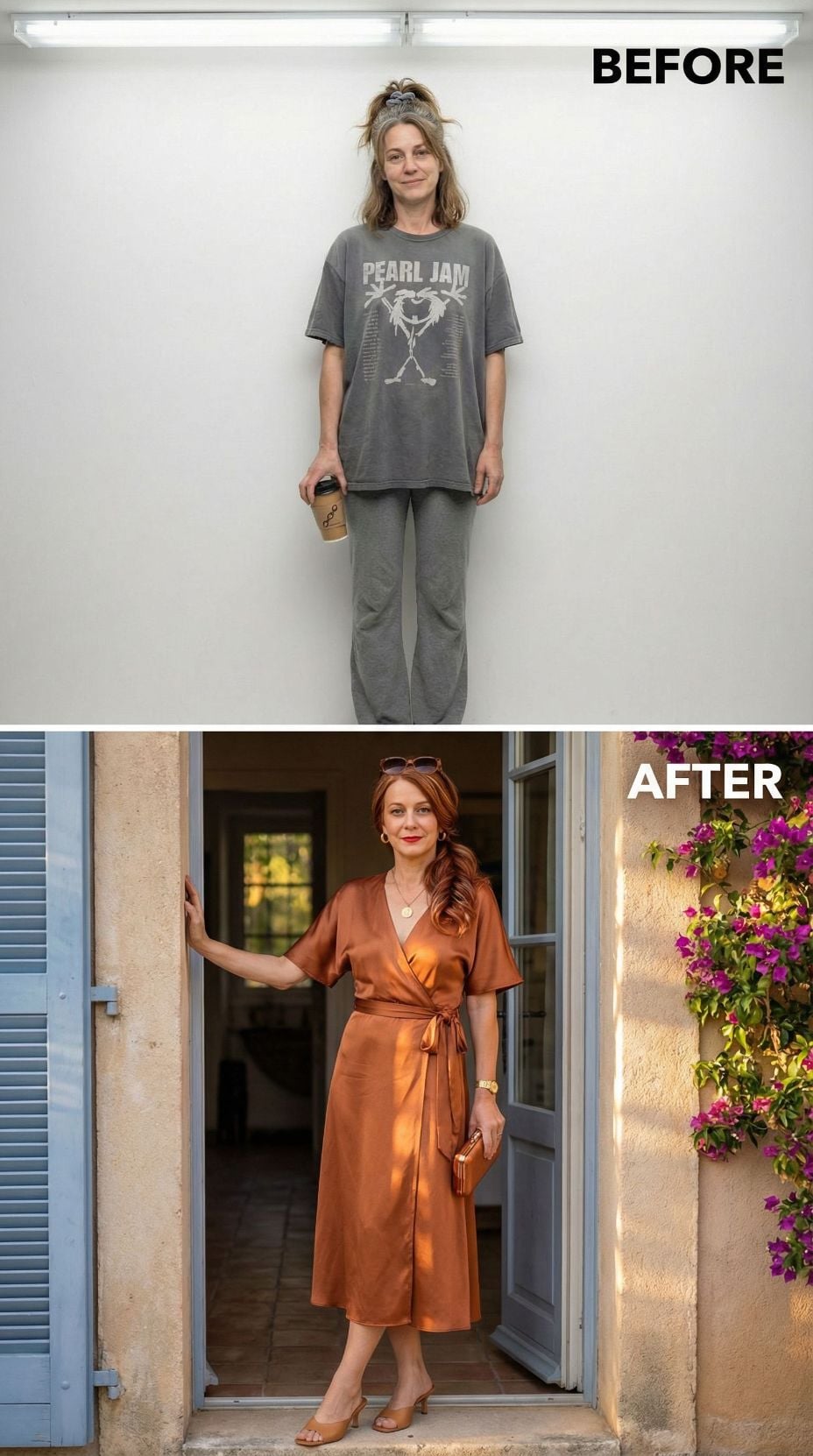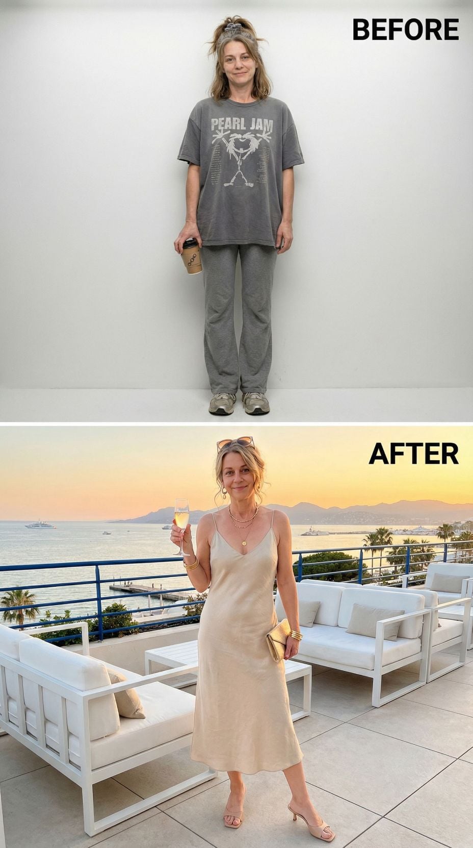 Pearl Jam concert tees transform into Mediterranean sophistication with this stunning makeover. The coral silk camisole paired with crisp white wide-leg trousers creates effortless French Riviera elegance. Layered gold jewelry and tortoiseshell sunglasses add luxurious finishing touches. White leather accessories and strappy sandals complete this transformation from stressed 43 year old mom in casual comfort wear to coastal chic perfection.