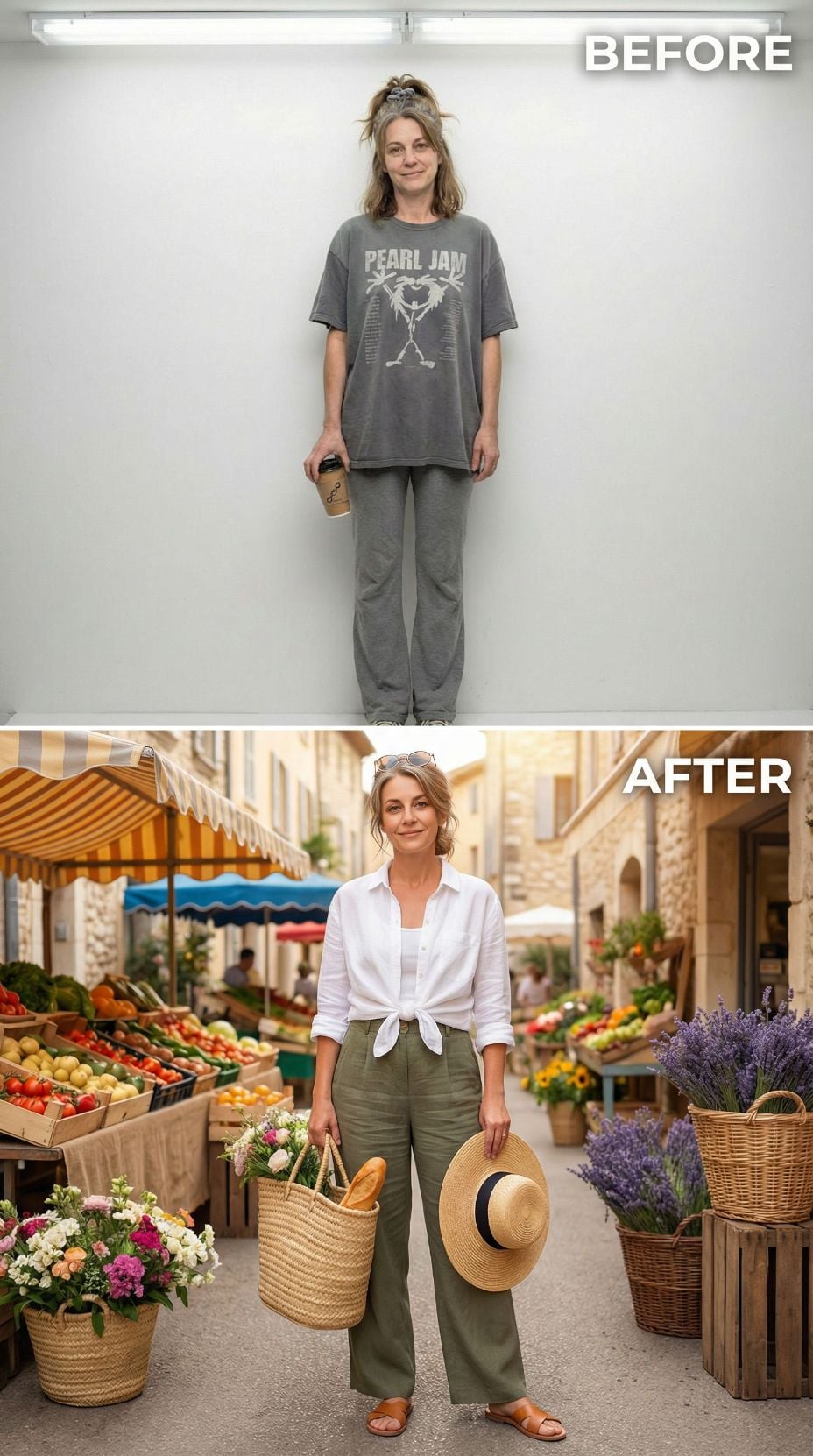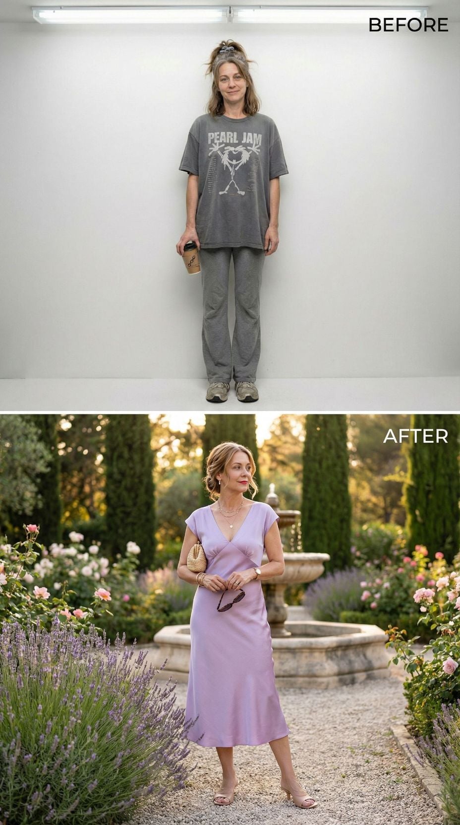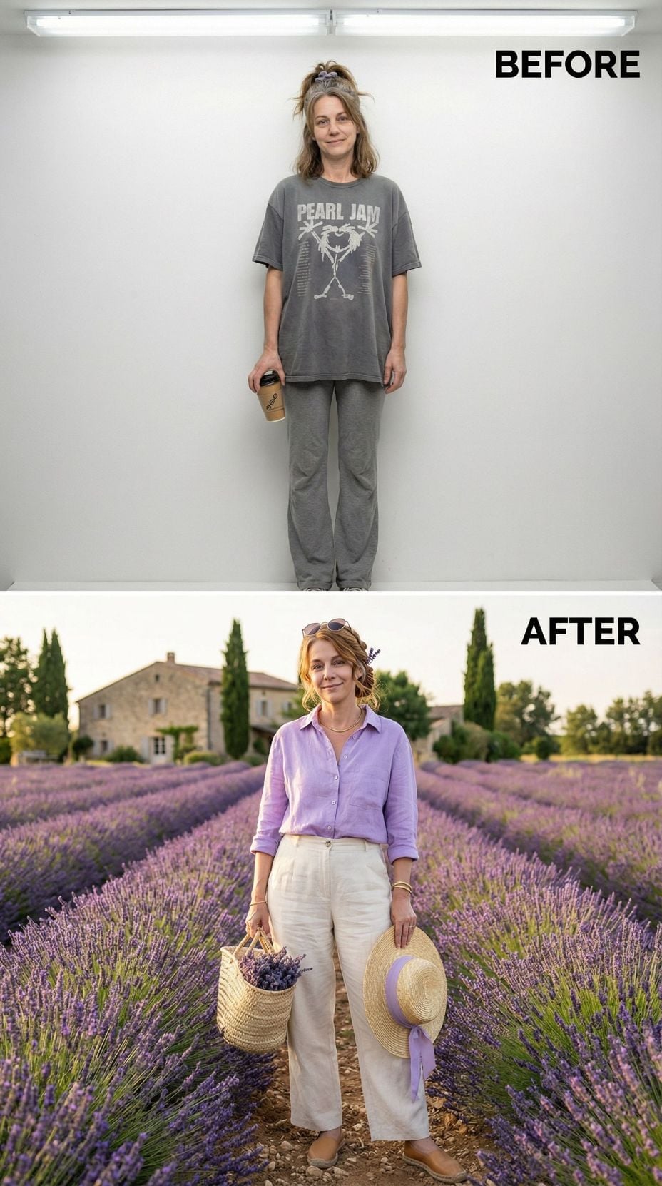 Lavender fields provide the perfect backdrop for this stunning transformation. The relaxed Pearl Jam tee and sweats evolve into sophisticated French countryside style featuring a crisp lilac linen shirt paired with flowing cream trousers. Golden hour lighting enhances the romantic purple palette while woven accessories and sunglasses complete this effortlessly chic European weekend look.