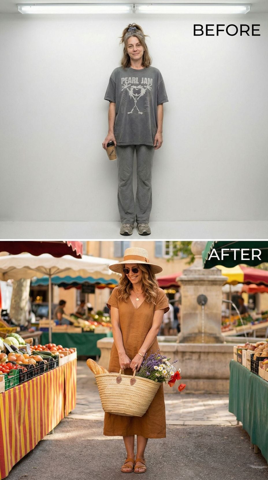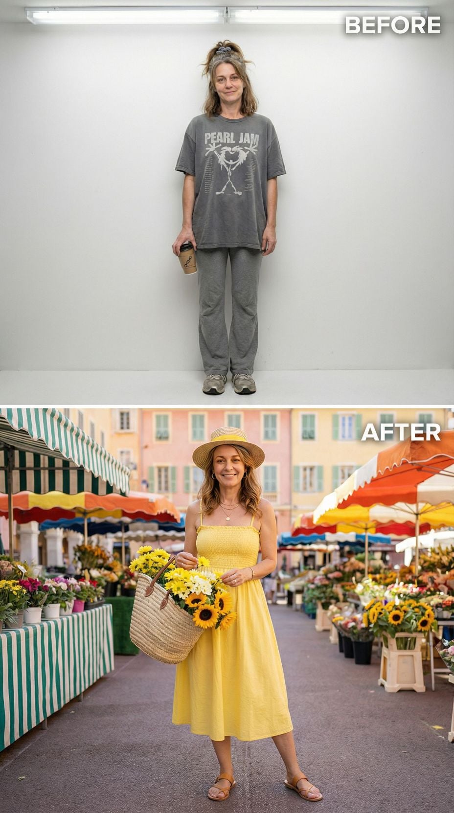 Gray loungewear transforms into sunny European sophistication with this stunning yellow midi dress makeover. The stressed 43 year old mom in casual comfort wear disappears as flowing fabric, strapless silhouette, and woven basket accessories create instant French Riviera charm. A straw hat and leather sandals complete this effortless market-strolling look that radiates vacation confidence and Mediterranean elegance.