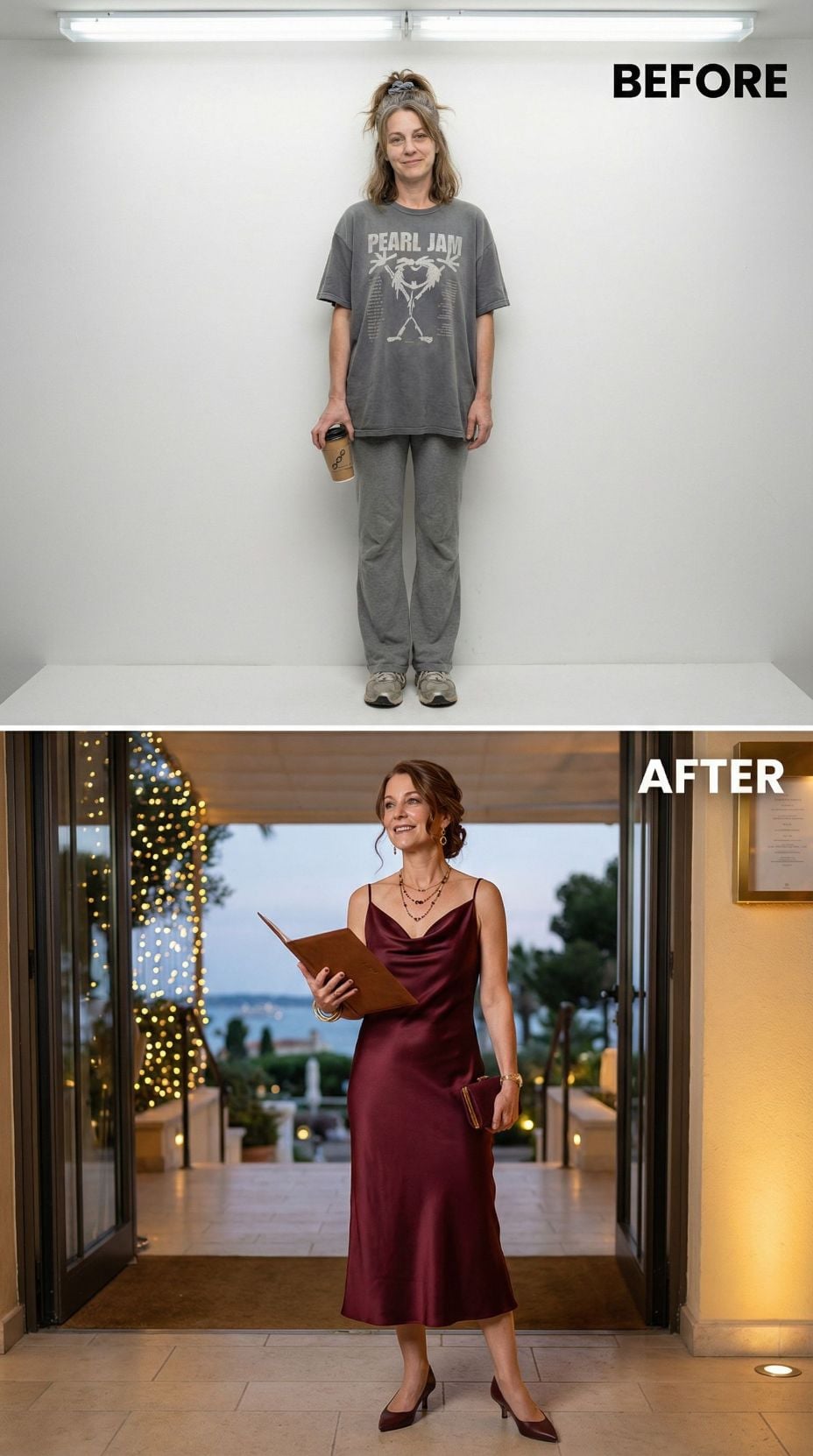 Burgundy silk transforms everything in this stunning makeover journey. The cowl-neck midi dress creates sophisticated draping that flatters every curve, while layered gold jewelry adds French Riviera glamour. Sleek low heels and an elegant updo complete the transition from weekend comfort to coastal chic. Perfect for sunset dinners overlooking the Mediterranean or upscale resort evenings.