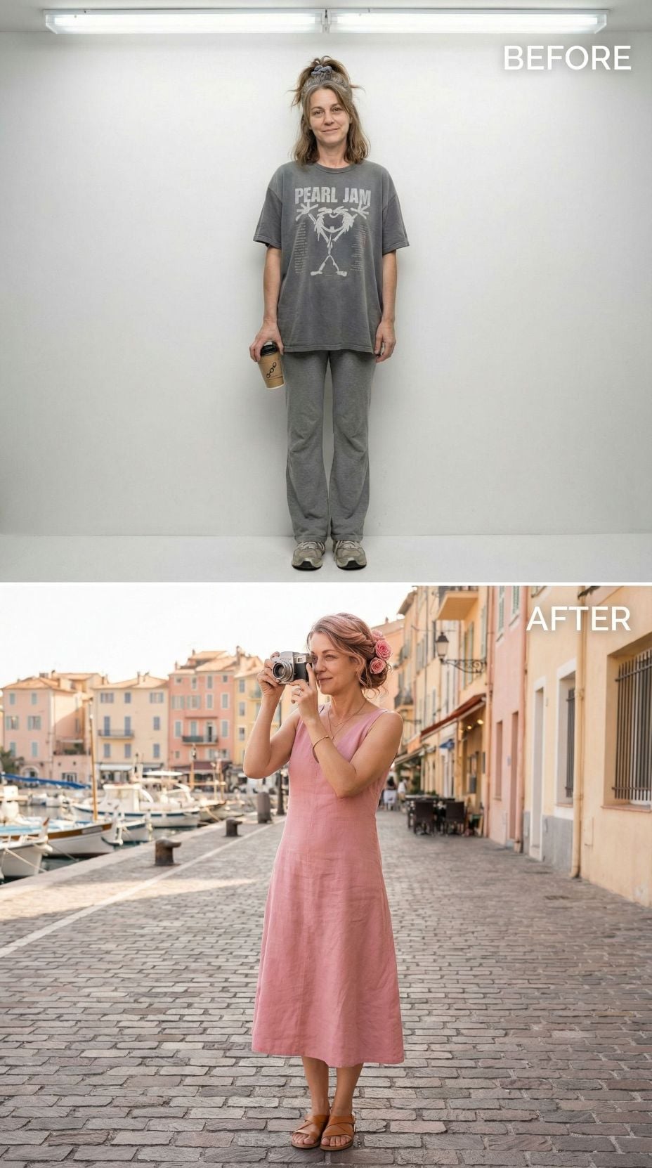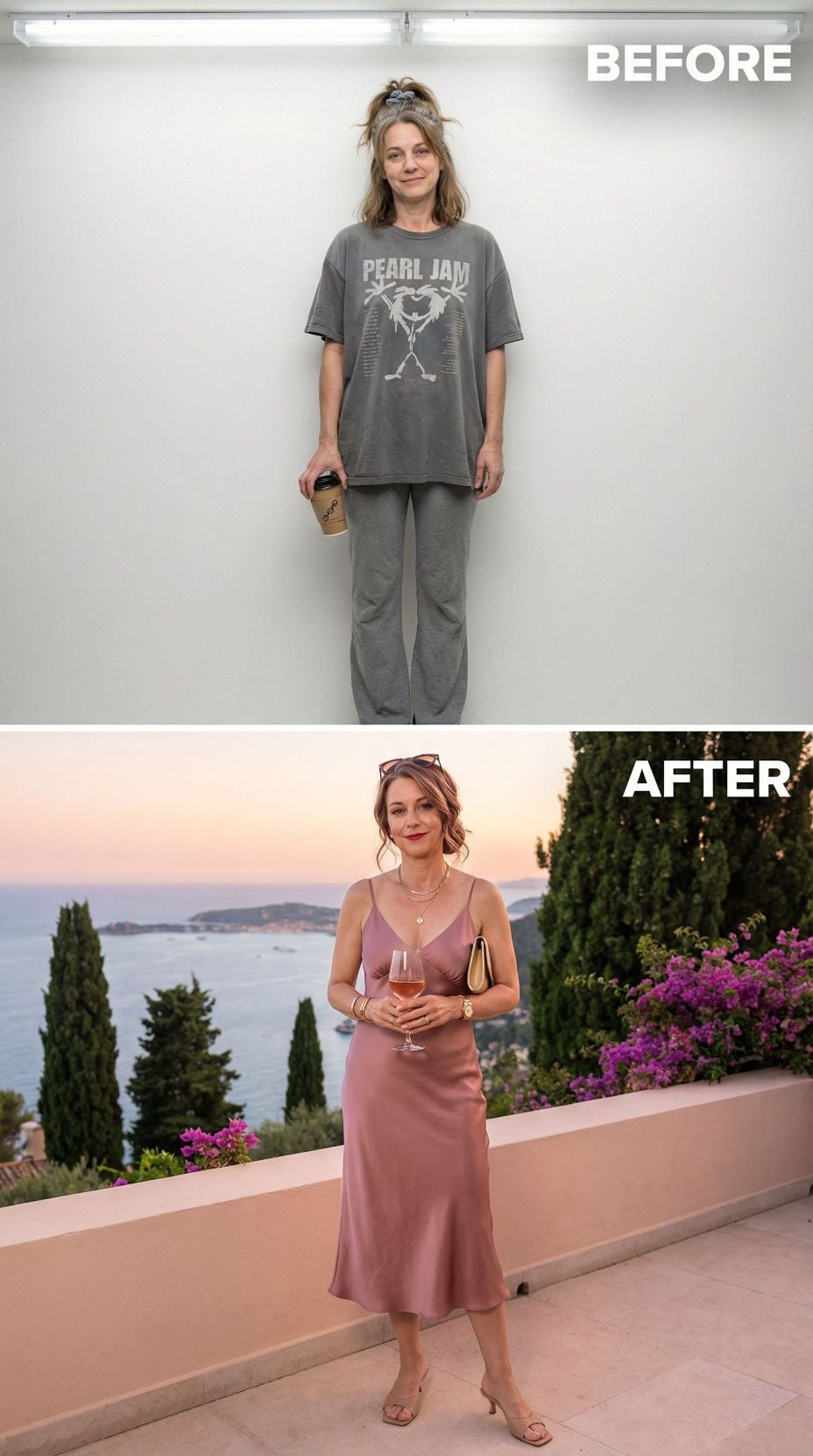 Pearl Jam tees and sweatpants disappear as this stunning blush midi dress takes center stage. The sleek silhouette hugs curves perfectly while maintaining elegant comfort for seaside strolls. Paired with nude strappy sandals and a woven clutch, this sophisticated ensemble channels effortless French coastal style. Her polished updo and radiant makeup complete the transformation into refined Mediterranean elegance.
