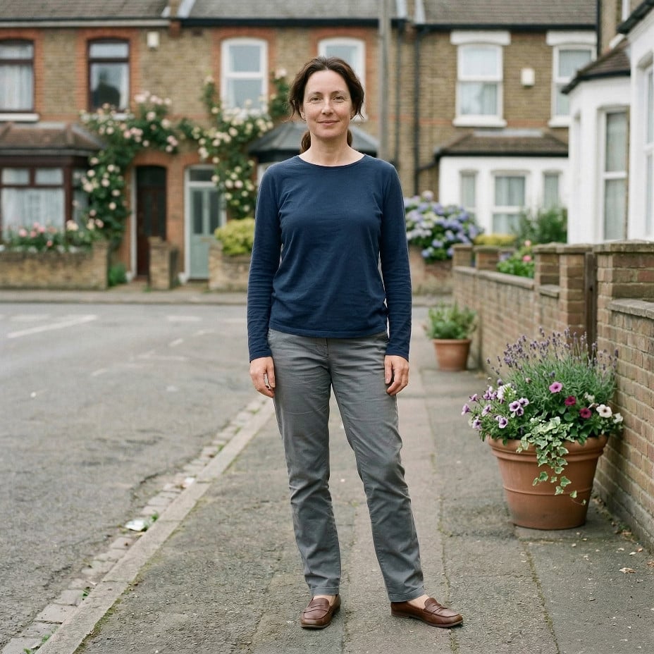 Relaxed grey trousers and a long-sleeve navy top stand on residential pavement surrounded by brick terraces and potted flowers. Hair sits close to the scalp. No visible jewelry appears. Hands rest at the sides.