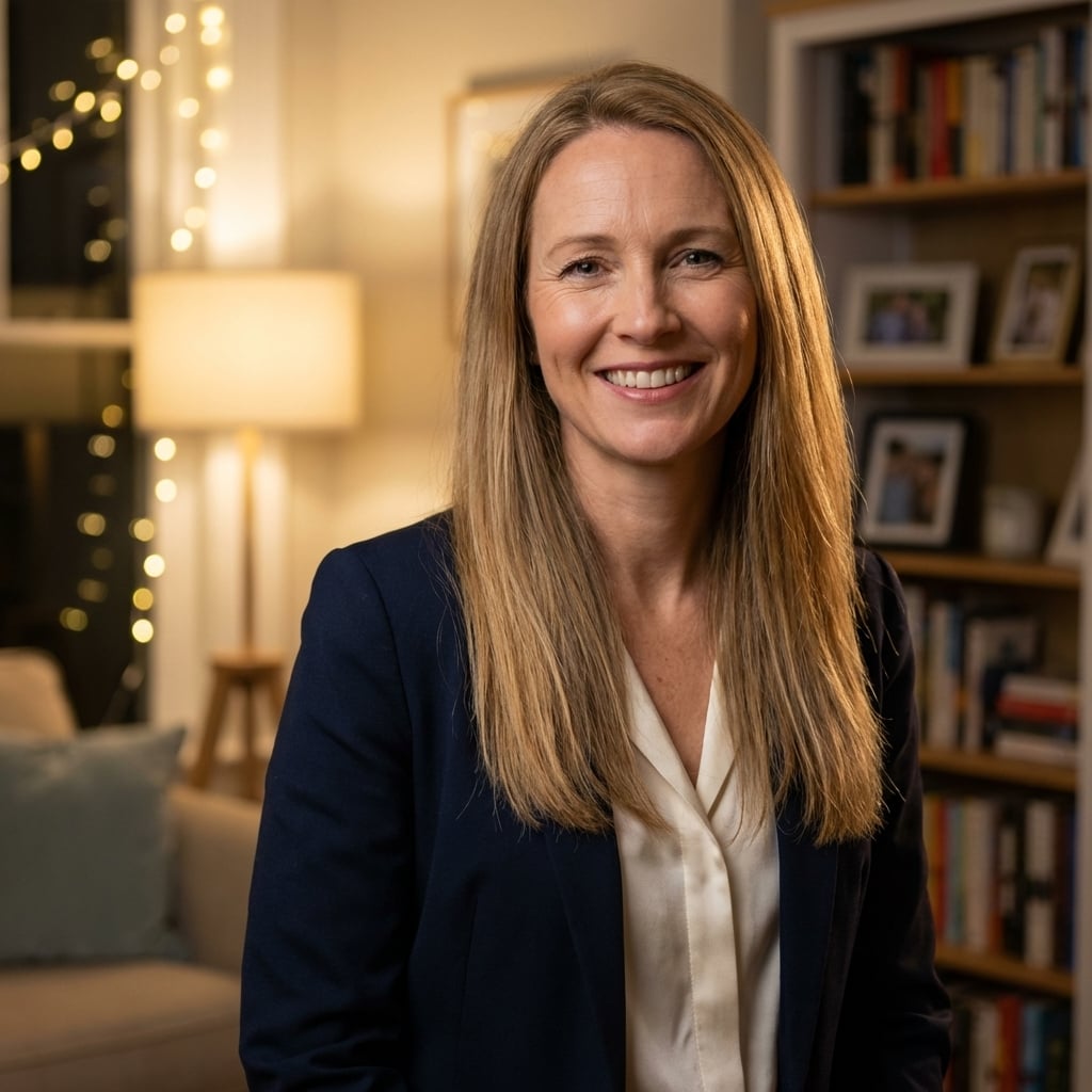 Cut to chin level with a slight internal curve, the bob sits just below the jaw and swings with natural movement. Lighter blonde panels at the crown separate cleanly from the deeper honey base. The navy blazer reads sharper against the shorter silhouette, its lapels no longer competing with curtains of length. Cream blouse fabric catches the warm lamp light differently now.