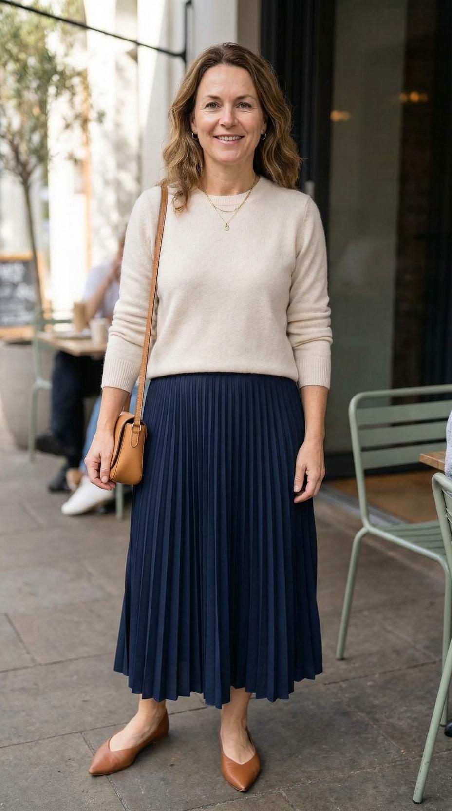 This sophisticated look perfectly captures effortless refinement for the modern woman. The combination of a cozy neutral sweater with a structured pleated skirt creates beautiful contrast between comfort and polish. The midi length is universally flattering and appropriate for countless occasions, from client meetings to weekend brunches. The coordinated leather accessories in warm cognac tones add a luxurious finishing touch that elevates the entire ensemble. This outfit demonstrates how classic pieces can feel fresh and contemporary when styled thoughtfully.