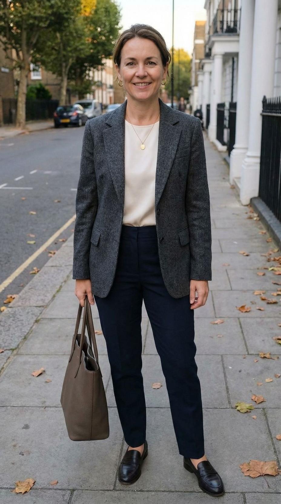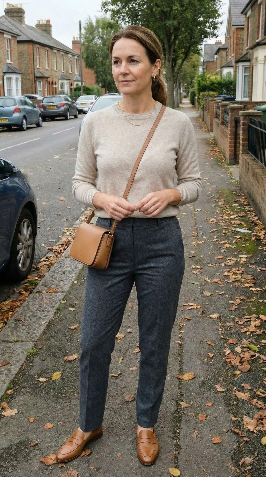 This timeless ensemble epitomizes sophisticated European style with its impeccable balance of comfort and polish. The luxuriously soft cream cashmere sweater creates a refined foundation, while the perfectly tailored charcoal wool trousers offer a sleek, professional silhouette. This classic color combination is elevated by thoughtful accessories – a structured cognac leather handbag adds warmth and richness, while polished black leather loafers ground the look with understated elegance. The delicate gold pendant necklace provides just the right touch of feminine detail without overwhelming the minimalist aesthetic. This outfit works seamlessly from boardroom meetings to weekend café visits, proving that the most impactful style statements often come from perfecting the basics with quality pieces and impeccable fit.