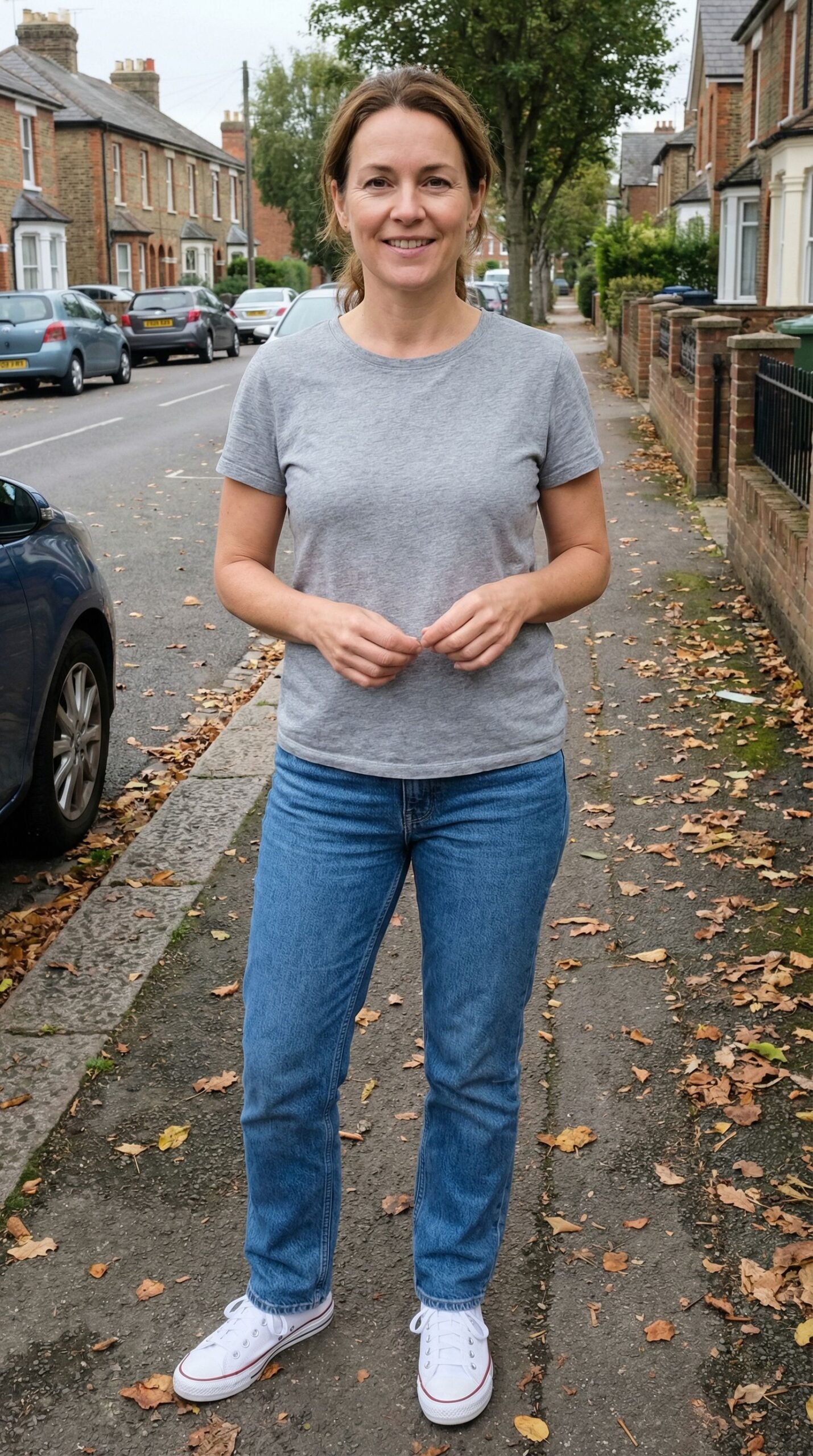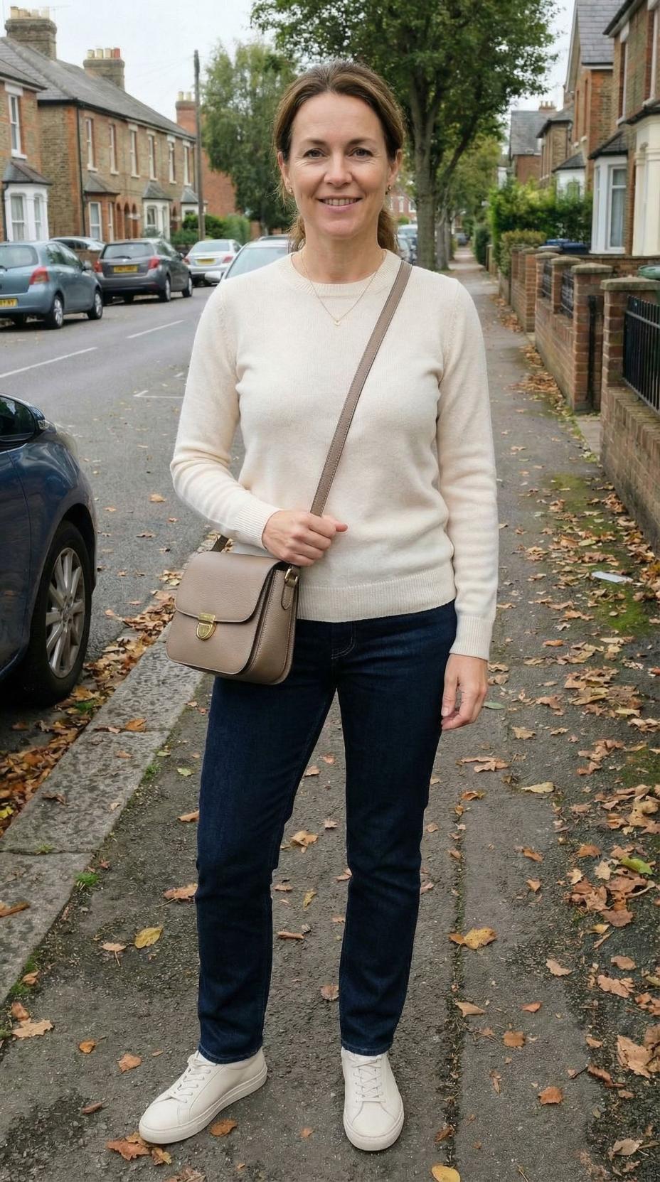 This timeless ensemble proves that sophistication doesn’t require complexity. The combination of a luxurious cream cashmere sweater with classic dark denim creates an elevated casual look that’s perfect for weekend brunches, school runs, or relaxed social gatherings. The structured crossbody bag adds a polished touch while maintaining practicality, and crisp white sneakers keep the overall aesthetic fresh and modern. This outfit demonstrates how investing in quality basics in neutral tones creates endless styling possibilities while looking effortlessly put-together.