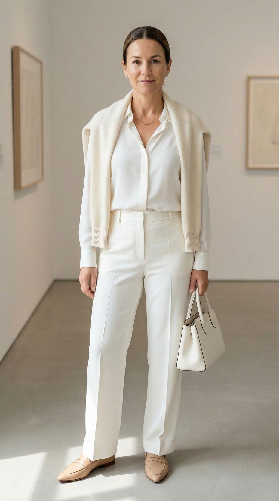 This sophisticated all-cream ensemble perfectly exemplifies understated luxury for the modern 45-year-old woman. The look combines relaxed tailoring with polished elements – a crisp button-down shirt layered under a cozy knit cardigan, paired with wide-leg trousers that create an elongating silhouette. The monochromatic palette feels fresh and contemporary while remaining effortlessly chic. Nude leather loafers and a structured handbag complete this gallery-worthy look that transitions seamlessly from business meetings to weekend art exhibitions. This outfit proves that neutrals are anything but boring when executed with intention and quality pieces.