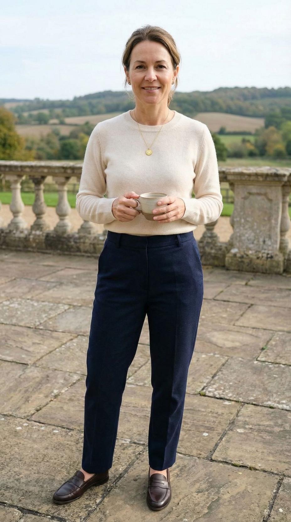 This effortlessly chic ensemble embodies refined countryside elegance with a perfect balance of comfort and polish. The soft cream cashmere sweater provides luxurious texture while maintaining a relaxed silhouette, paired beautifully with tailored navy trousers that offer a flattering high-waisted fit. The look is grounded with classic leather loafers, creating an ensemble that’s perfect for weekend entertaining, casual business meetings, or countryside retreats. This sophisticated color palette and clean lines make it an ideal template for the modern woman who values timeless style over fleeting trends.