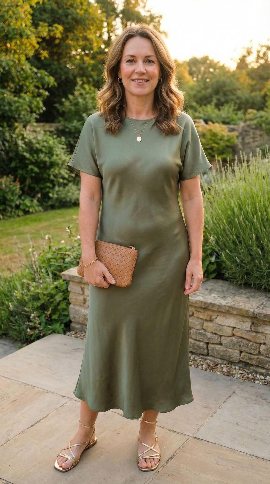 This sophisticated ensemble perfectly captures refined casual elegance with its flowing sage green midi dress that skims the body beautifully. The relaxed short sleeves and midi length create a flattering silhouette that’s both comfortable and chic. She’s elevated the look with understated gold jewelry and a structured woven clutch, while strappy metallic sandals add just the right amount of shine. The soft, natural styling against the garden backdrop showcases how to achieve polished sophistication for outdoor events, weekend gatherings, or elevated casual occasions.