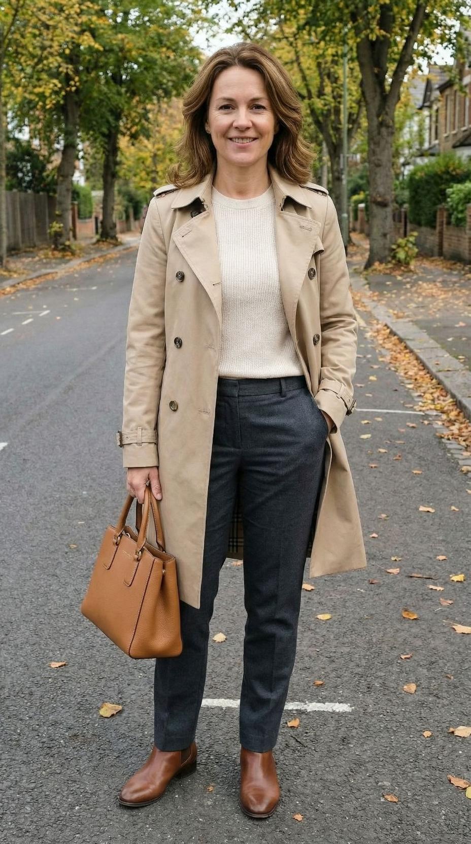 This timeless fall look epitomizes effortless elegance for the modern 45-year-old woman. The neutral color palette creates a sophisticated foundation that works seamlessly from office meetings to weekend errands. The classic trench coat serves as the perfect transitional piece for unpredictable autumn weather, while the fitted sweater and tailored trousers create a polished silhouette. The cognac leather accessories add warmth and richness to the ensemble, proving that investing in quality basics in complementary tones will always yield chic results. This outfit demonstrates how to look put-together without appearing overly formal or trying too hard.