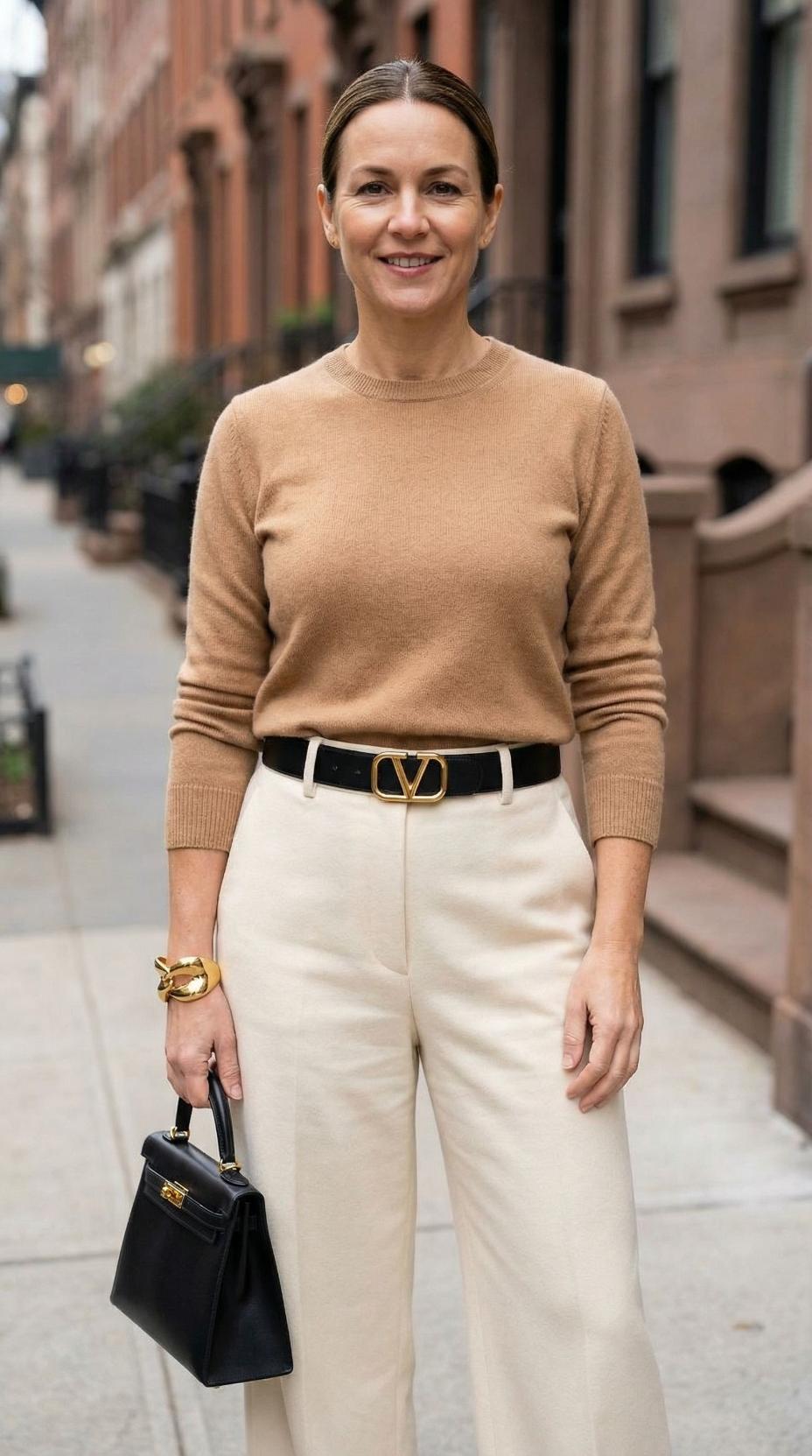 This ensemble perfectly captures the art of refined dressing with its harmonious blend of camel and cream tones. The fitted cashmere sweater creates a polished silhouette while remaining comfortable for all-day wear. High-waisted wide-leg trousers in a crisp cream linen offer both sophistication and movement, elevated by the structured black leather handbag that adds a striking contrast. The gold hardware details throughout the look – from the statement belt buckle to the chunky bracelet – provide luxurious finishing touches that take this outfit from boardroom to dinner with ease. This is timeless dressing at its finest, proving that neutral doesn’t mean boring.