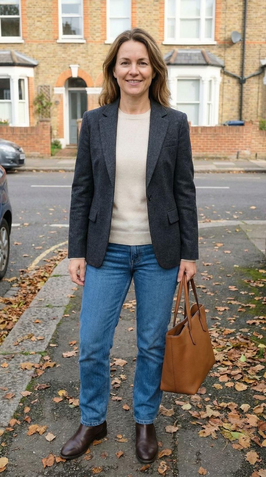 This ensemble perfectly embodies the elevated casual look that every sophisticated woman should master. The combination of a structured charcoal blazer with relaxed denim creates an effortless balance between polished and approachable. The neutral cream sweater serves as the perfect bridge between the tailored outerwear and casual bottoms, while the rich cognac leather accessories add warmth and luxury to the overall look. This outfit demonstrates how to look put-together for everything from coffee dates to casual Friday at the office, proving that elegance doesn’t require formal wear.