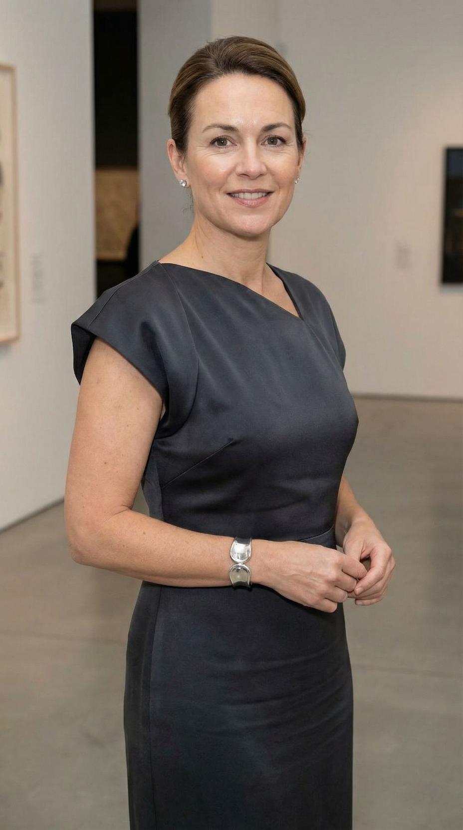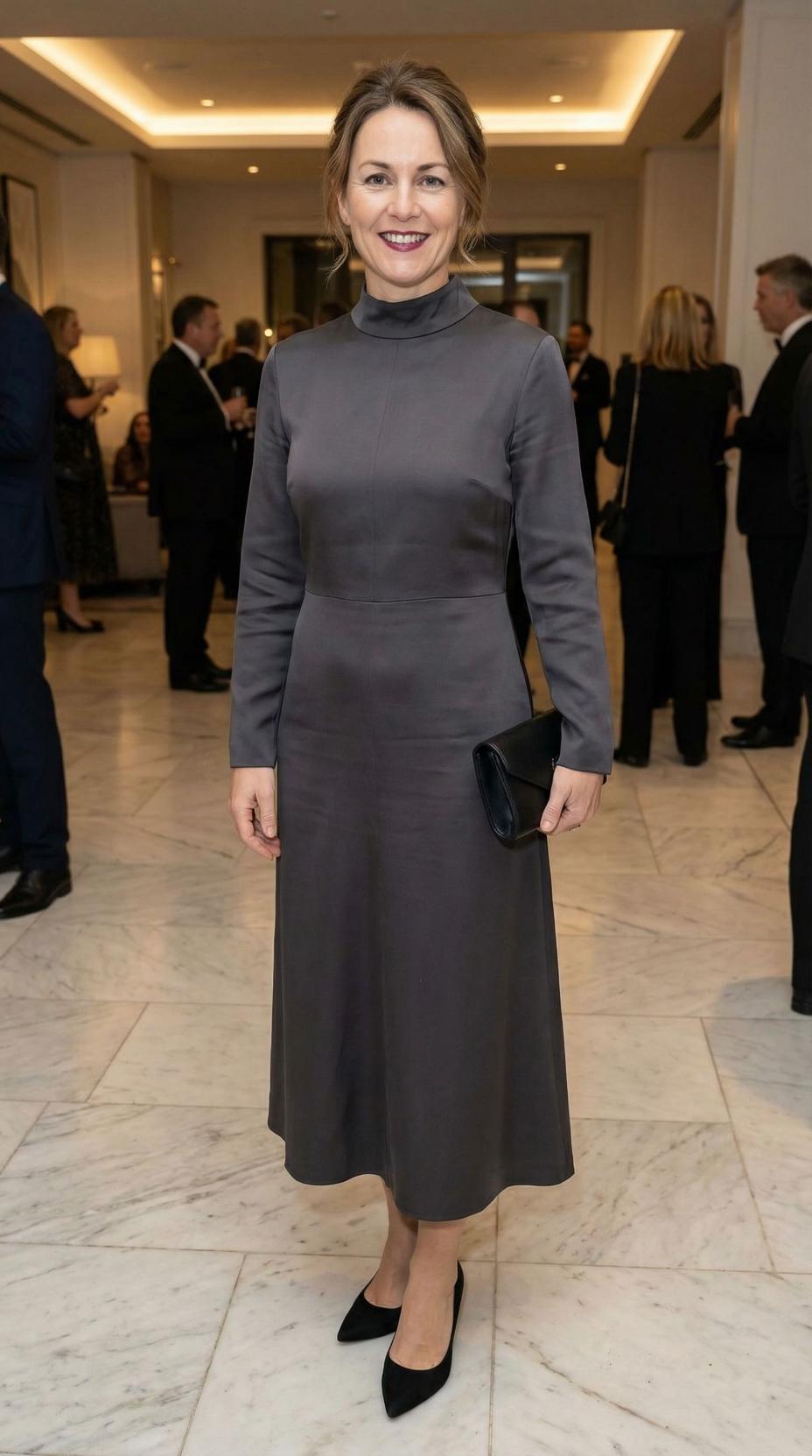 This ensemble perfectly captures refined minimalism for the modern 45-year-old woman. The sleek charcoal dress features clean lines and a sophisticated silhouette that flatters without being overly trendy. The look is elevated through impeccable fit, quality fabric, and thoughtful styling that speaks to confidence and professional polish. This is exactly the type of versatile piece that works seamlessly from boardroom to evening events, proving that sometimes the most powerful statement is understated elegance.