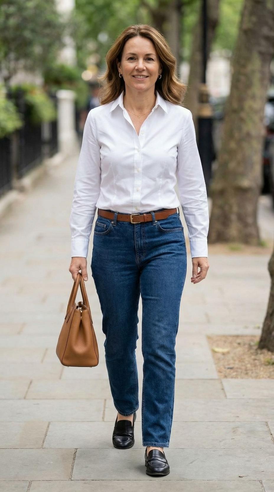 This ensemble proves that sometimes the most impactful looks are built on wardrobe fundamentals executed flawlessly. The crisp white button-down tucked into perfectly fitted denim creates an effortlessly polished foundation that works from coffee dates to client meetings. The rich cognac leather accessories add warmth and luxury to the palette, while the relaxed straight-leg jeans offer both comfort and contemporary styling. This is sophisticated dressing at its finest – clean lines, quality pieces, and thoughtful proportions that celebrate classic American style with a modern twist.