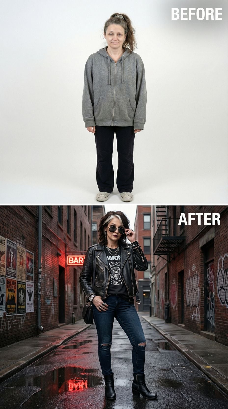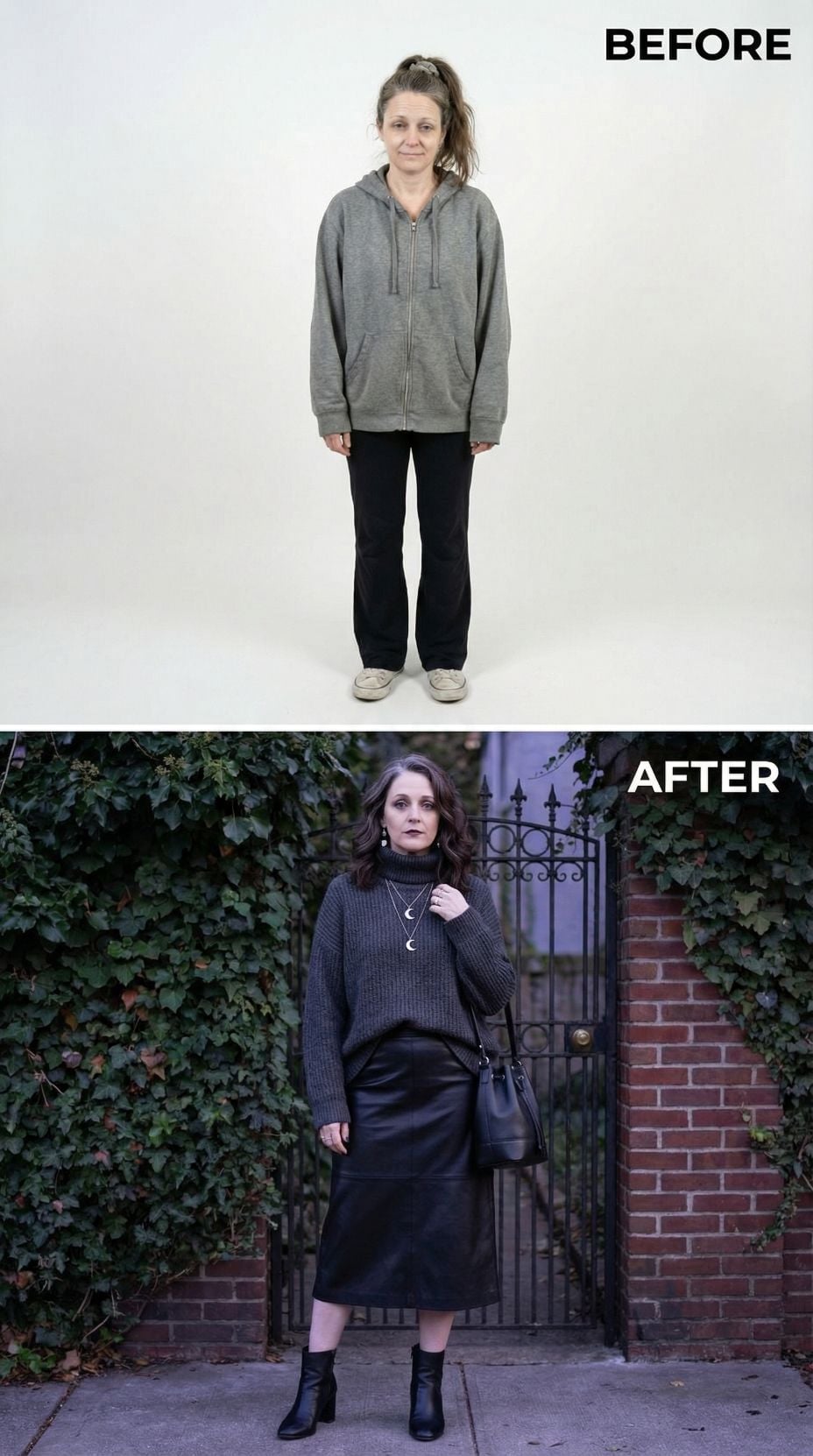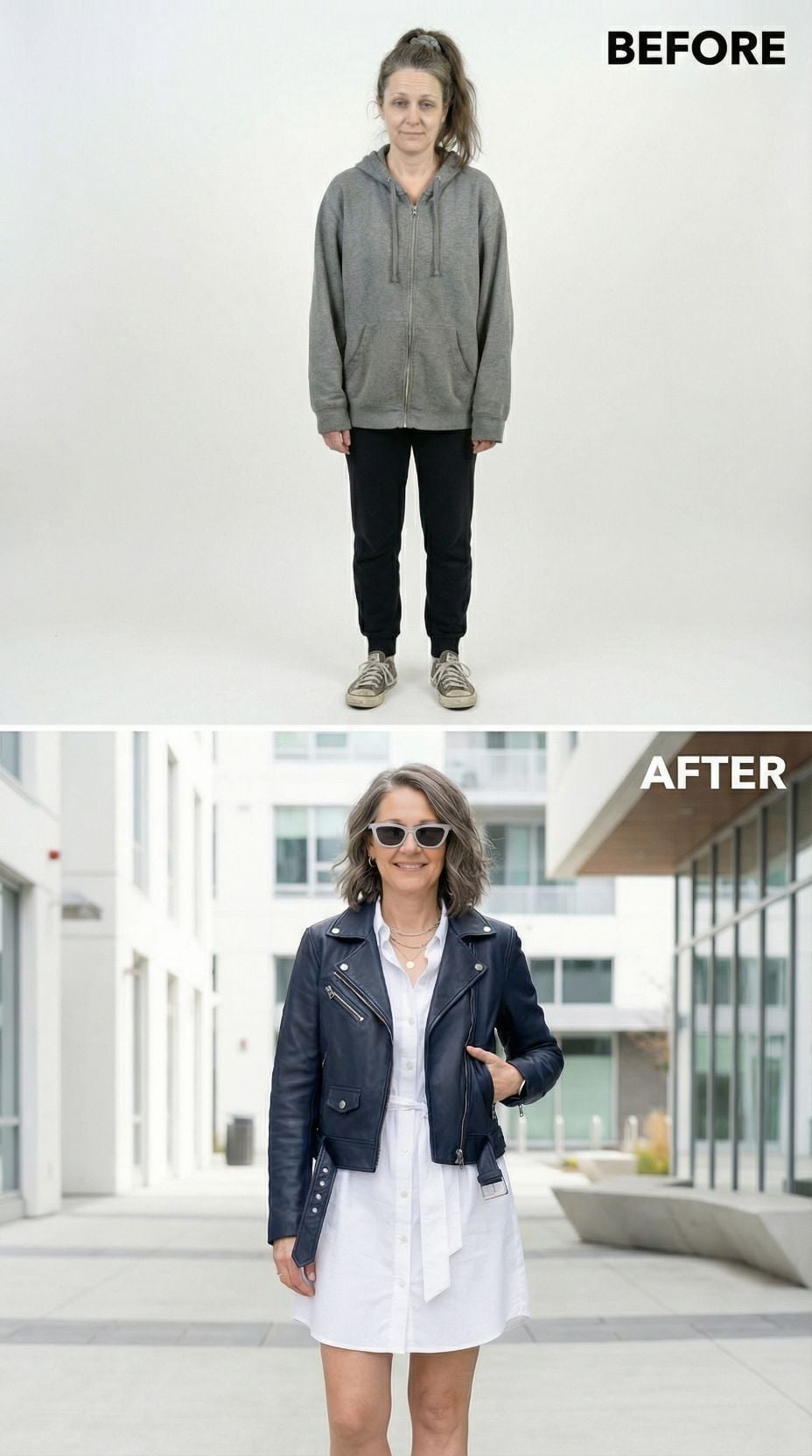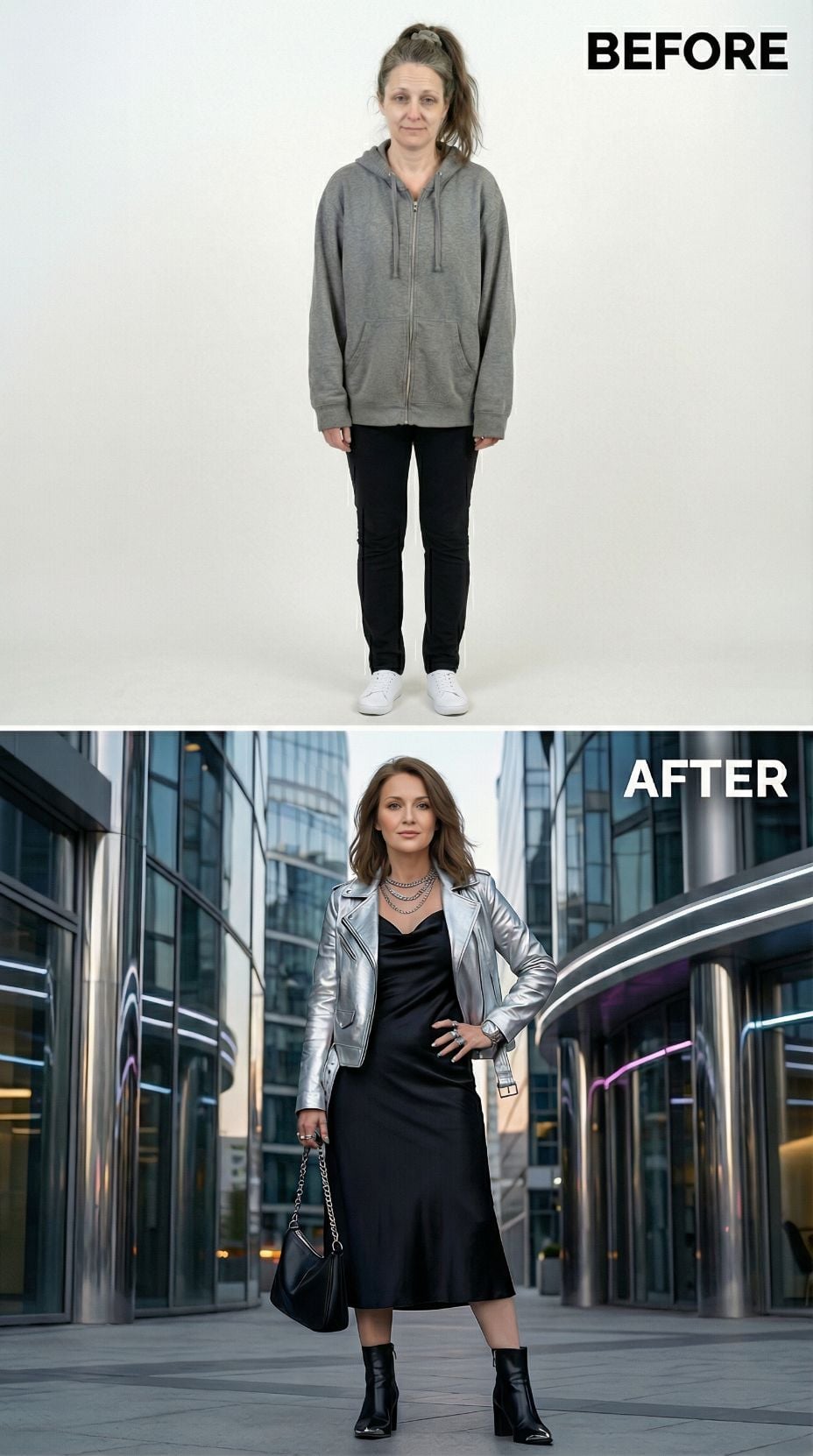 Silver leather transforms everything in this stunning metamorphosis. The metallic moto jacket pairs perfectly with a sleek black midi dress, creating an effortlessly cool silhouette that screams confidence. Layered silver chains and black ankle boots complete the look, while the polished hair and makeup elevate this tired suburban 44 year old woman into a downtown goddess ready to conquer the city streets.