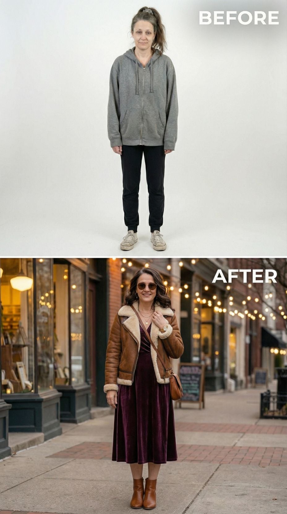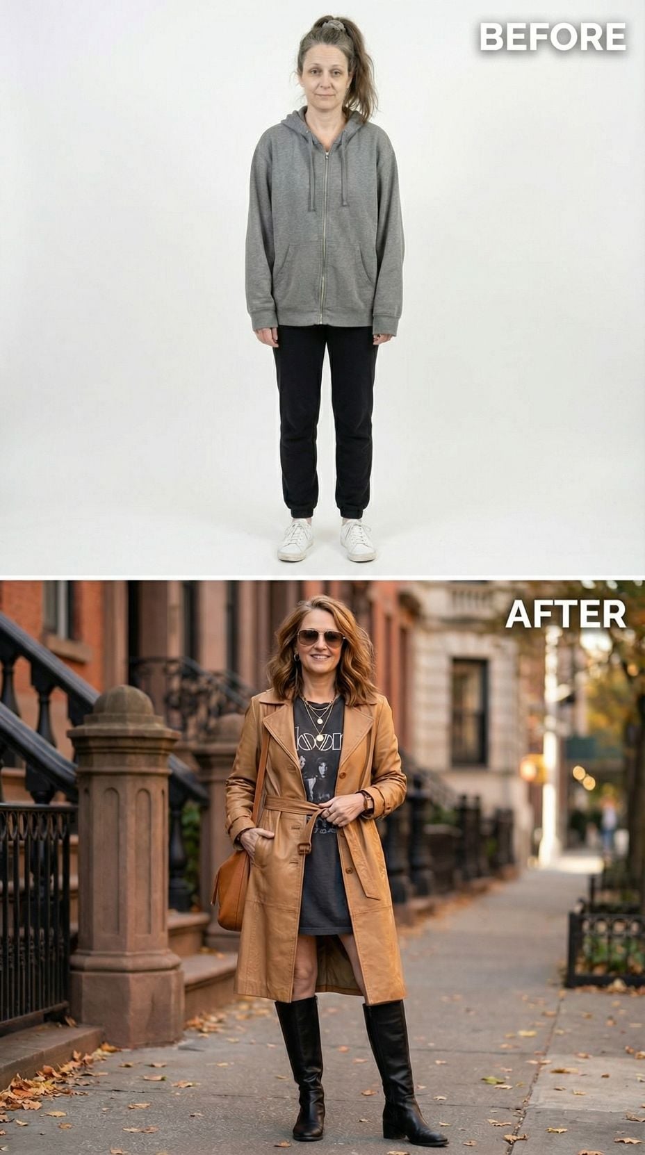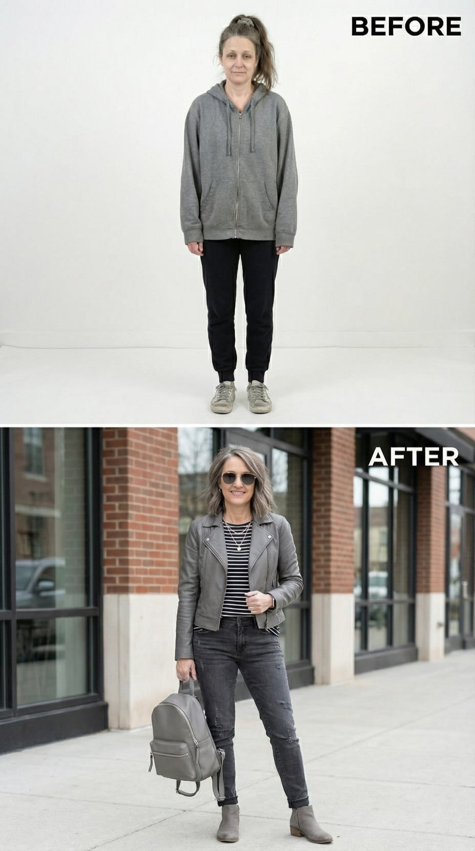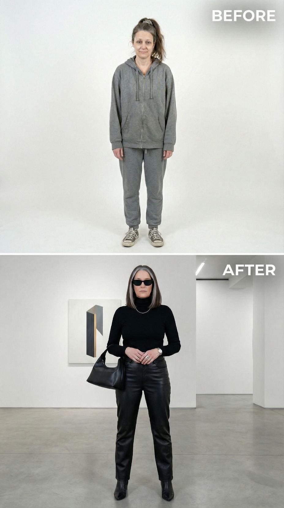 Silver leather transforms everything in this stunning metamorphosis. The metallic moto jacket pairs perfectly with a sleek black midi dress, creating an effortlessly cool silhouette that screams confidence. Layered silver chains and black ankle boots complete the look, while the polished hair and makeup elevate this tired suburban 44 year old woman into a downtown goddess ready to conquer the city streets.