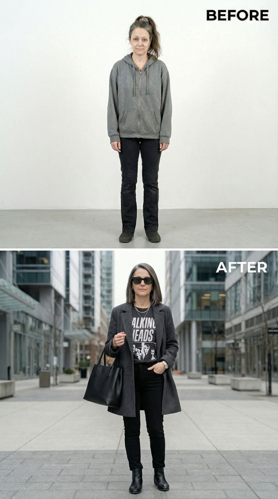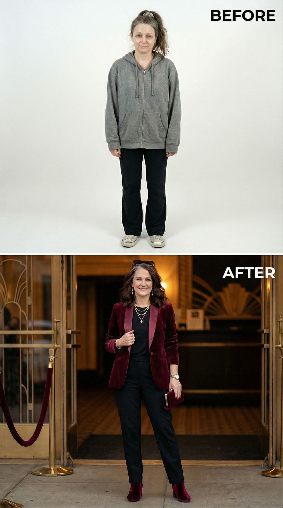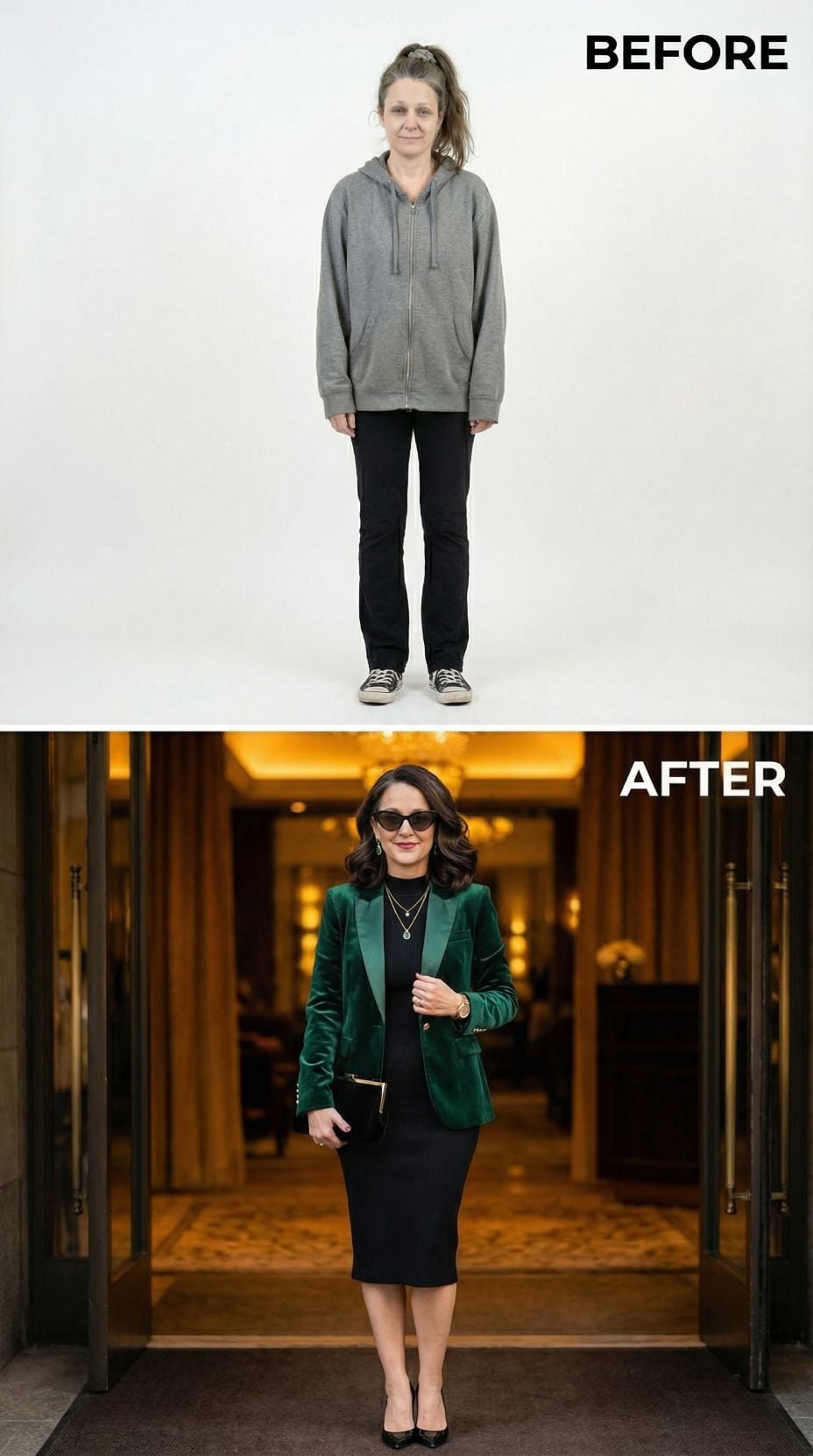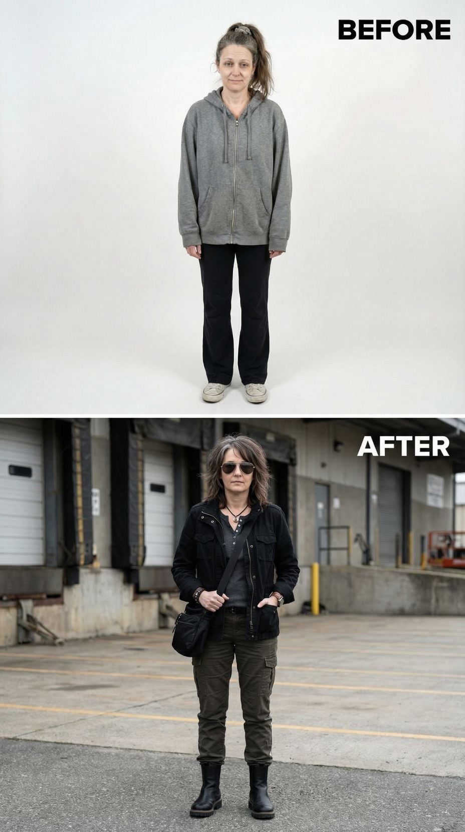 Silver leather transforms everything in this stunning metamorphosis. The metallic moto jacket pairs perfectly with a sleek black midi dress, creating an effortlessly cool silhouette that screams confidence. Layered silver chains and black ankle boots complete the look, while the polished hair and makeup elevate this tired suburban 44 year old woman into a downtown goddess ready to conquer the city streets.