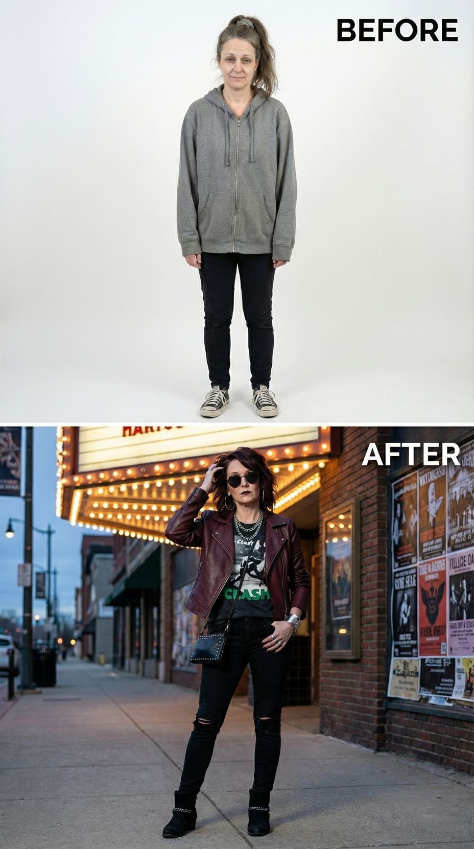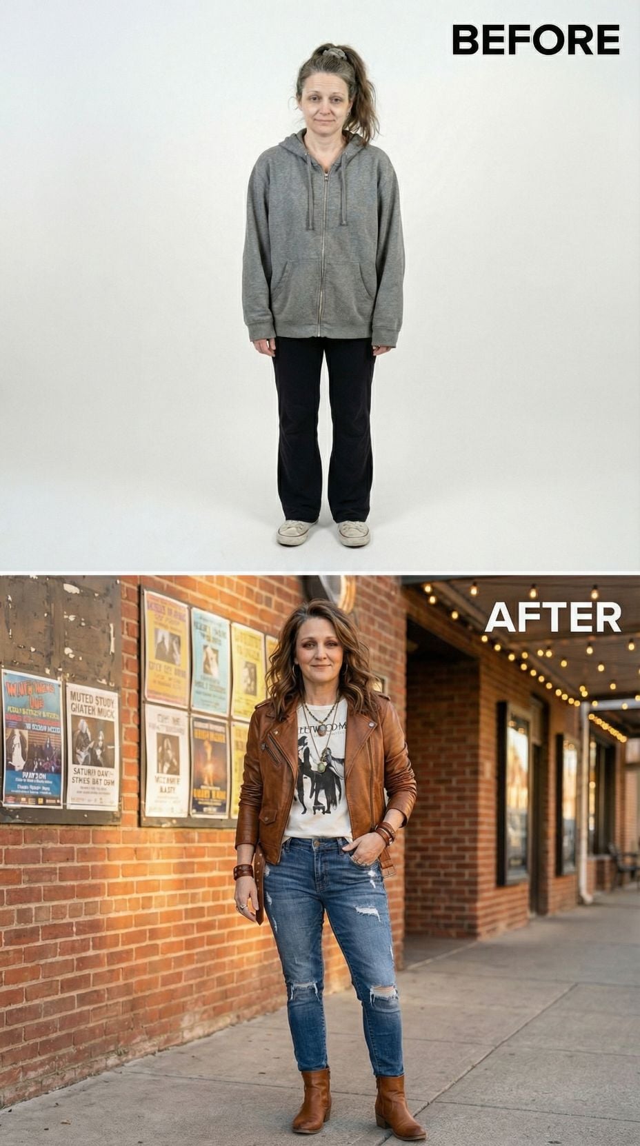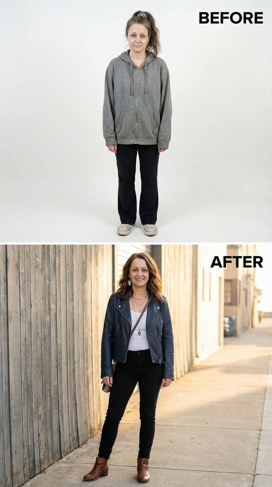 Black leather transforms everything in this stunning makeover from tired suburban 44 year old woman to rock goddess. The fitted moto jacket paired with sleek black jeans creates an instantly cool silhouette, while layered necklaces and brown ankle boots add authentic rocker details. Professionally styled waves and confident posing complete this powerful transformation that proves the right jacket can revolutionize your entire look.