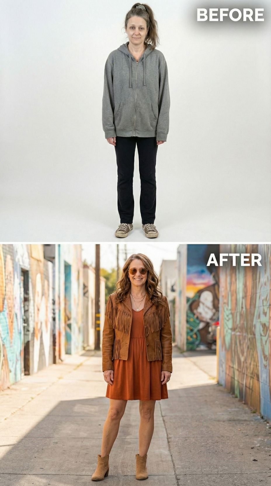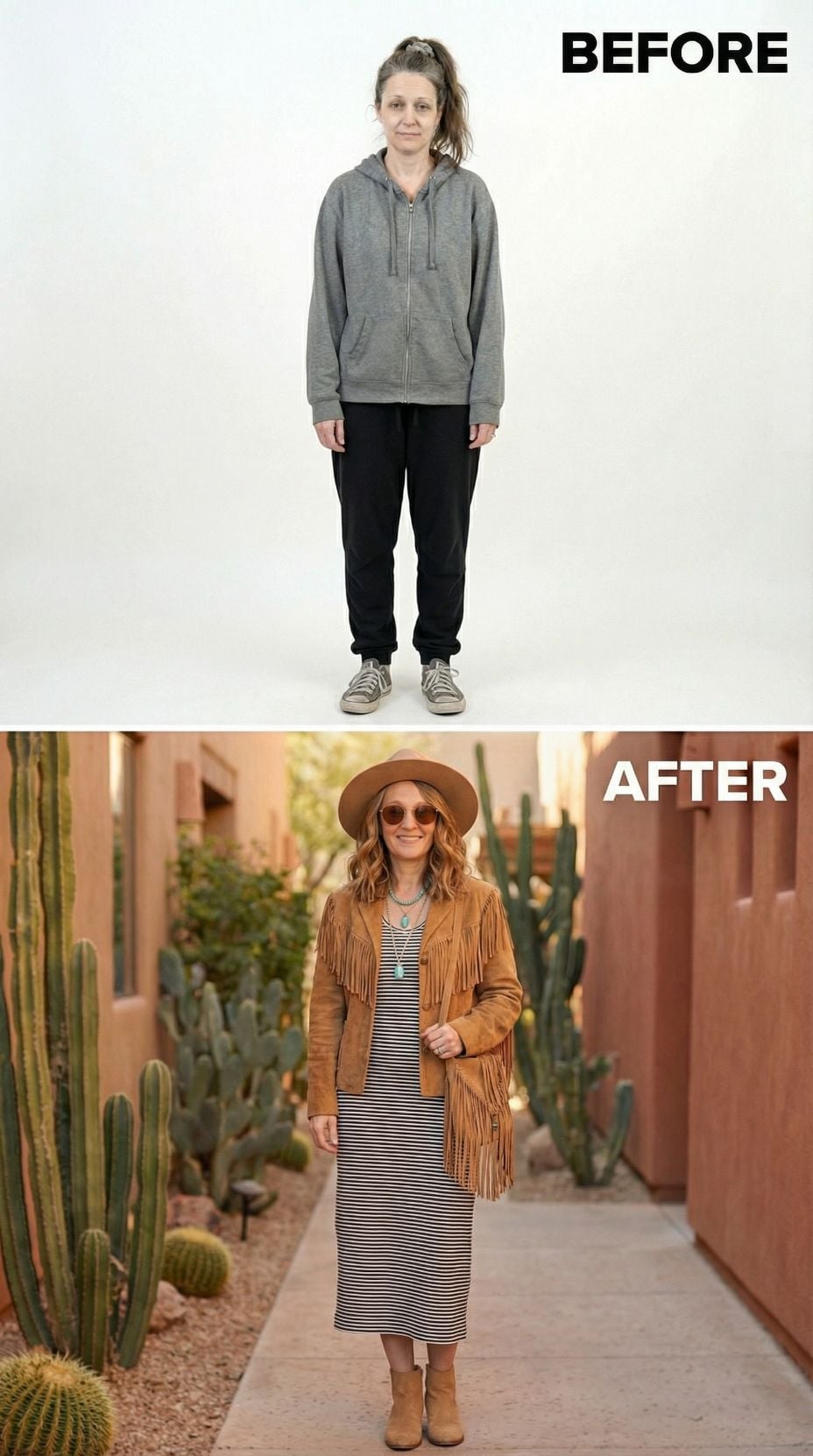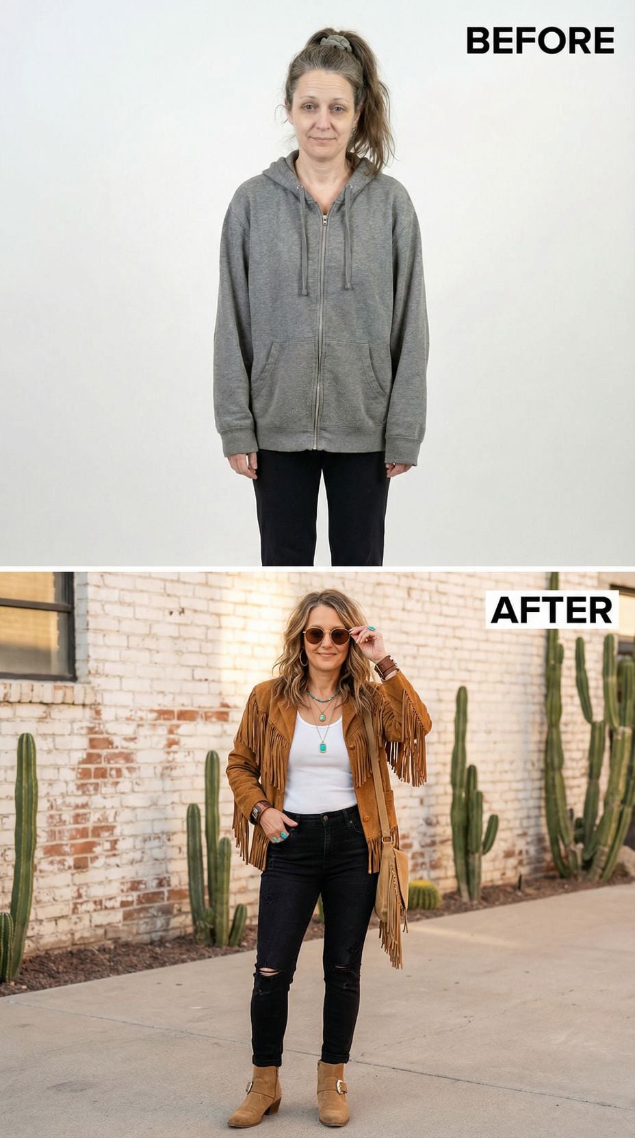 Fringe transforms everything in this southwestern-inspired makeover that trades dowdy gray hoodies for caramel suede perfection. The brown leather jacket with cascading fringe details creates movement and edge, while turquoise jewelry adds authentic desert vibes. Distressed black jeans and tan ankle boots ground the look with rock-and-roll attitude. Round sunglasses complete this boho transformation that screams festival-ready confidence.
